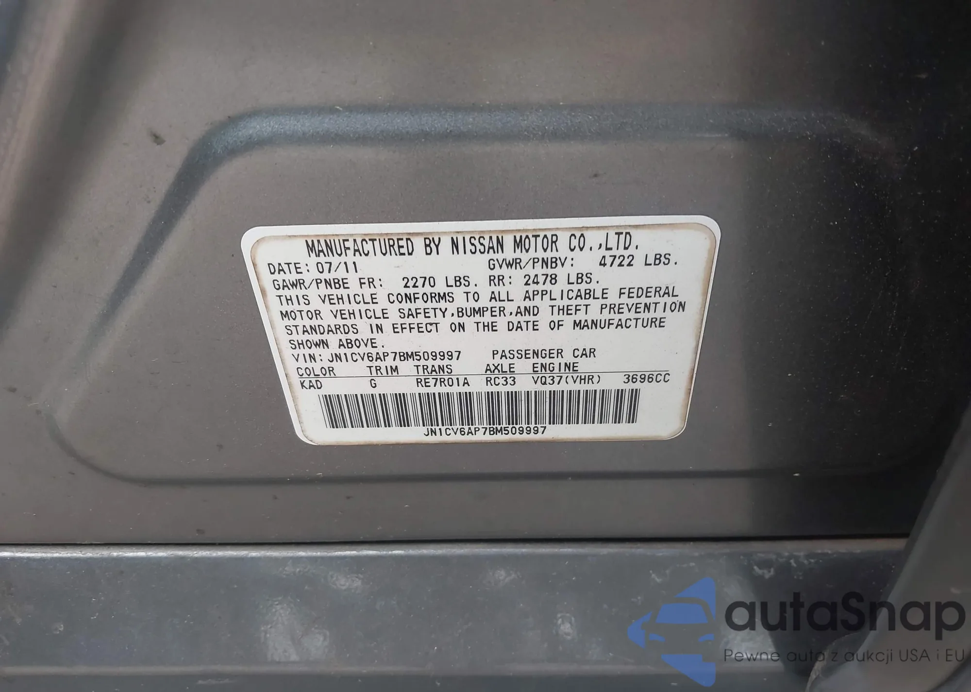 LOT: 42327218 VIN: JN1CV6AP7BM509997