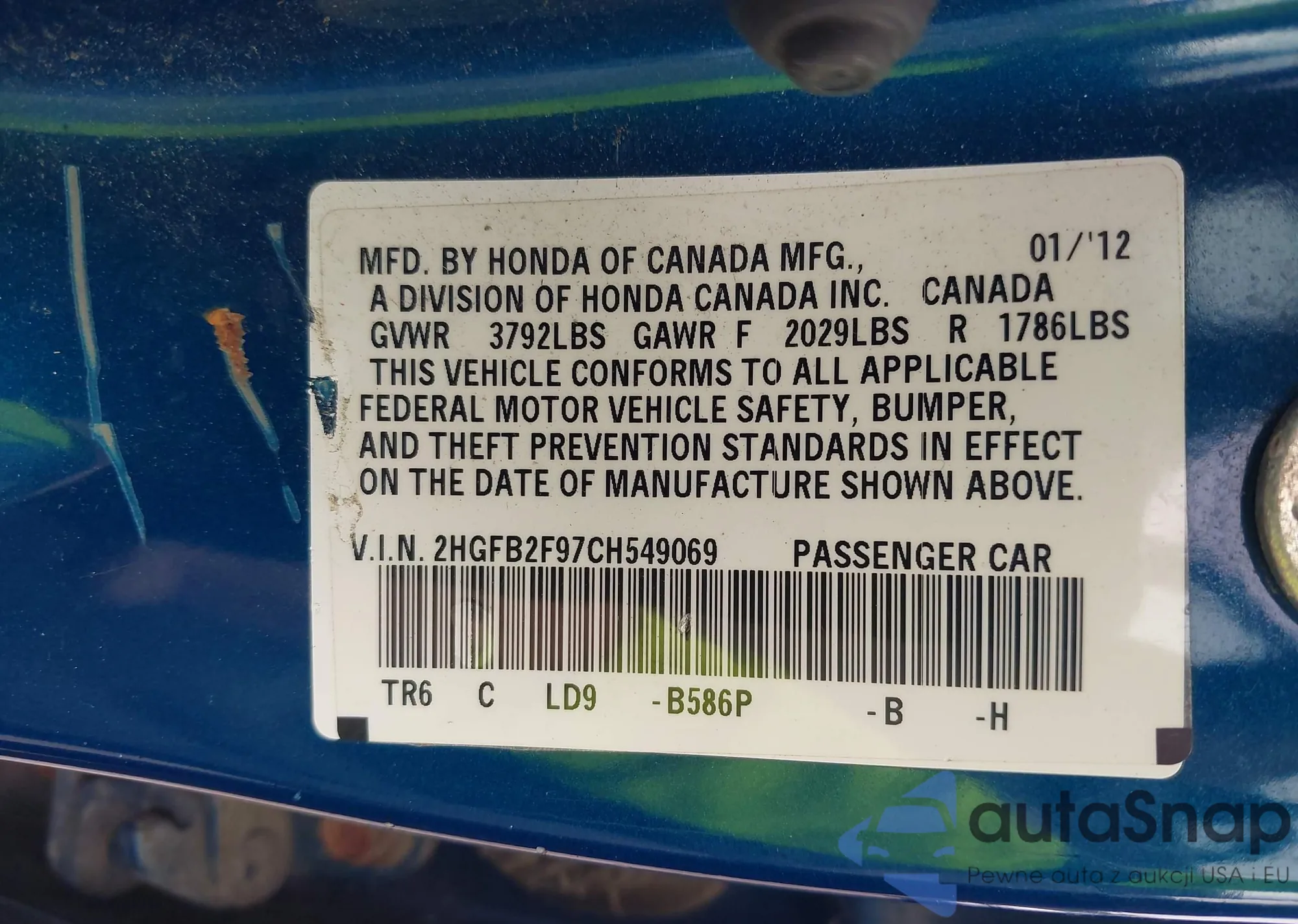 • VIN 2HGFB2F97CH549069