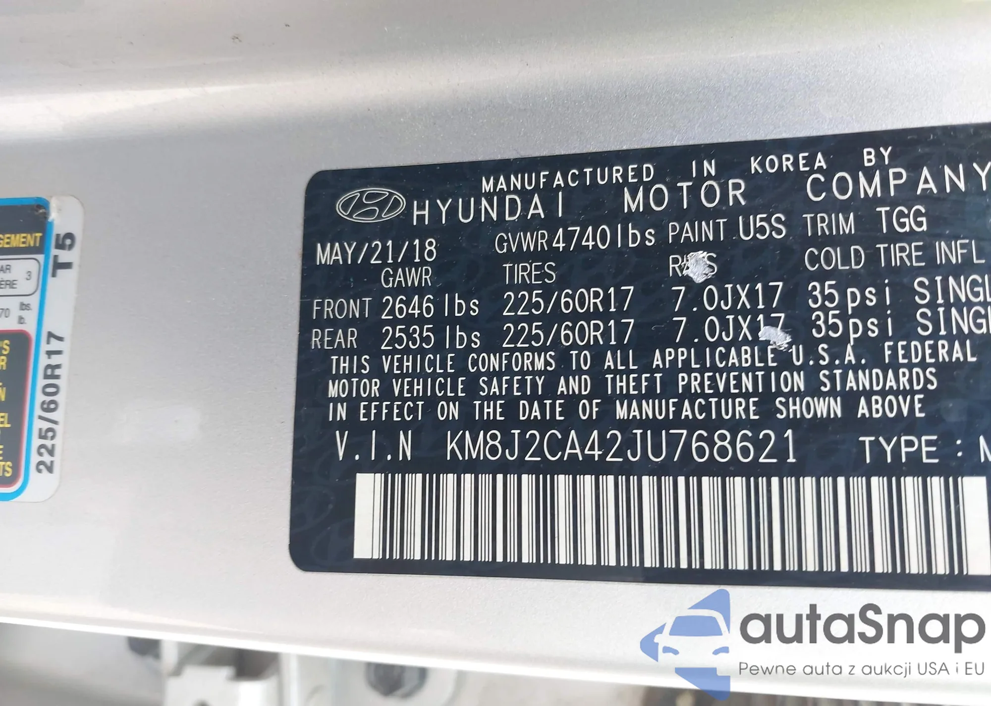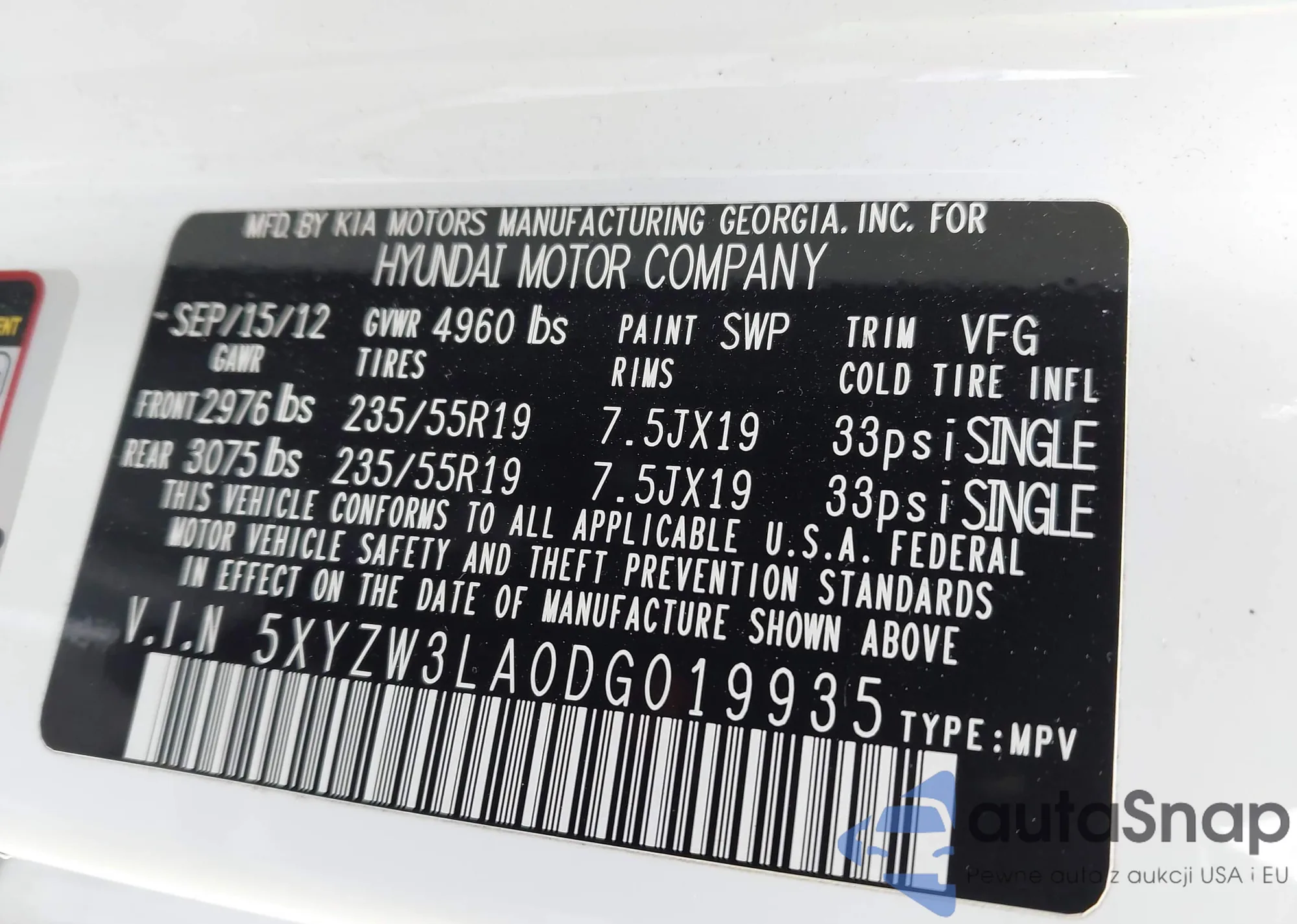 • VIN 5XYZW3LA0DG019935