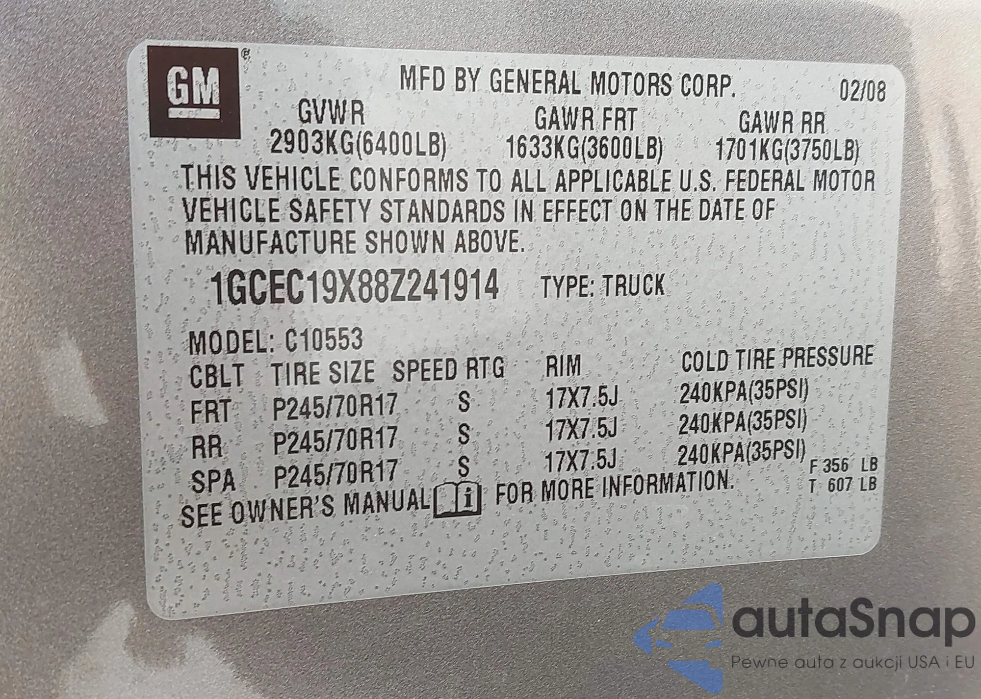 • VIN 1GCEC19X88Z241914