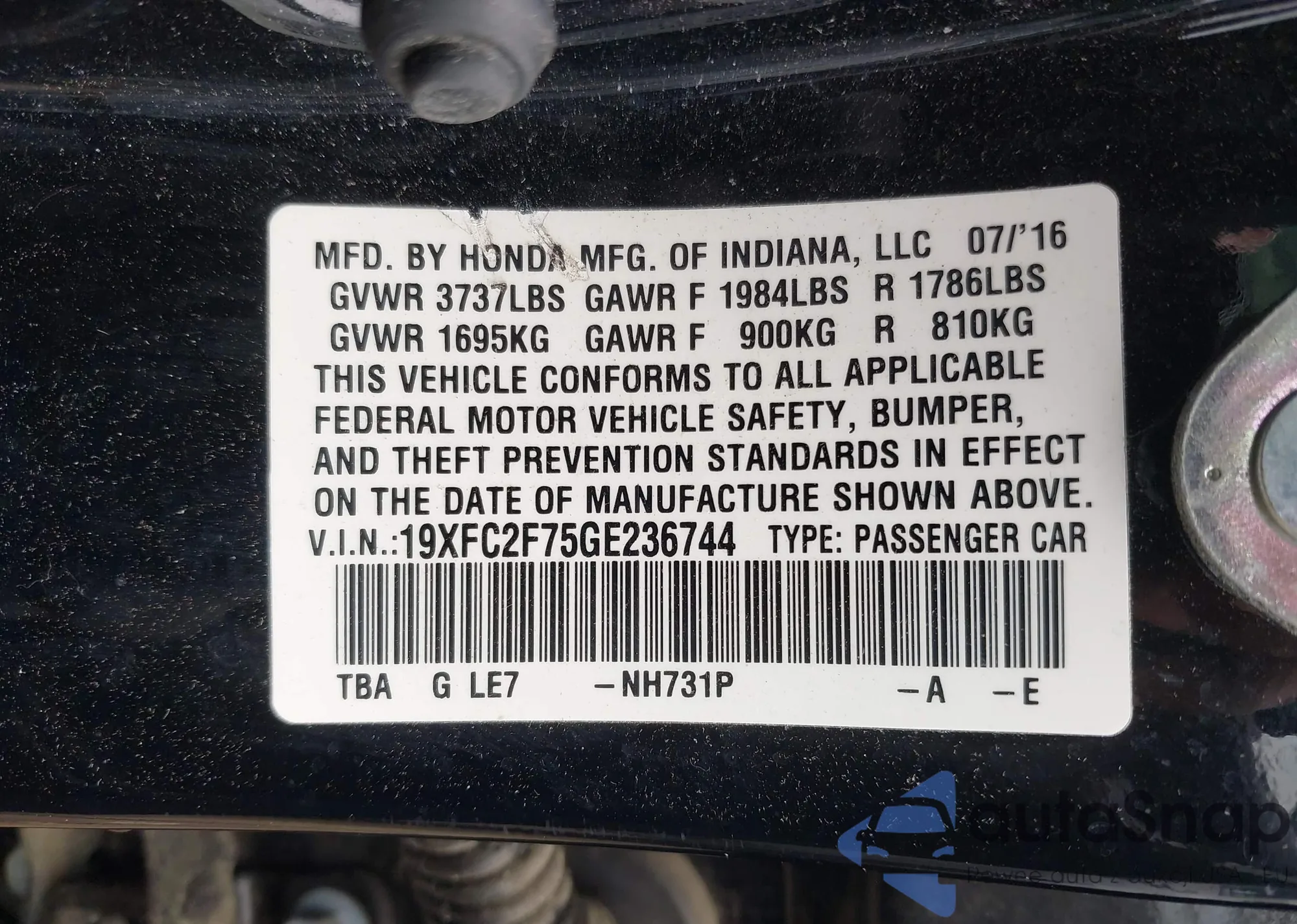 • VIN 19XFC2F75GE236744