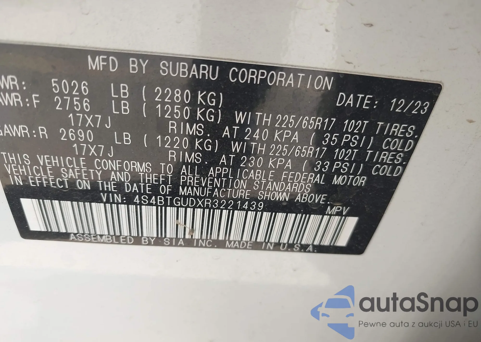 • VIN 4S4BTGUDXR3221439