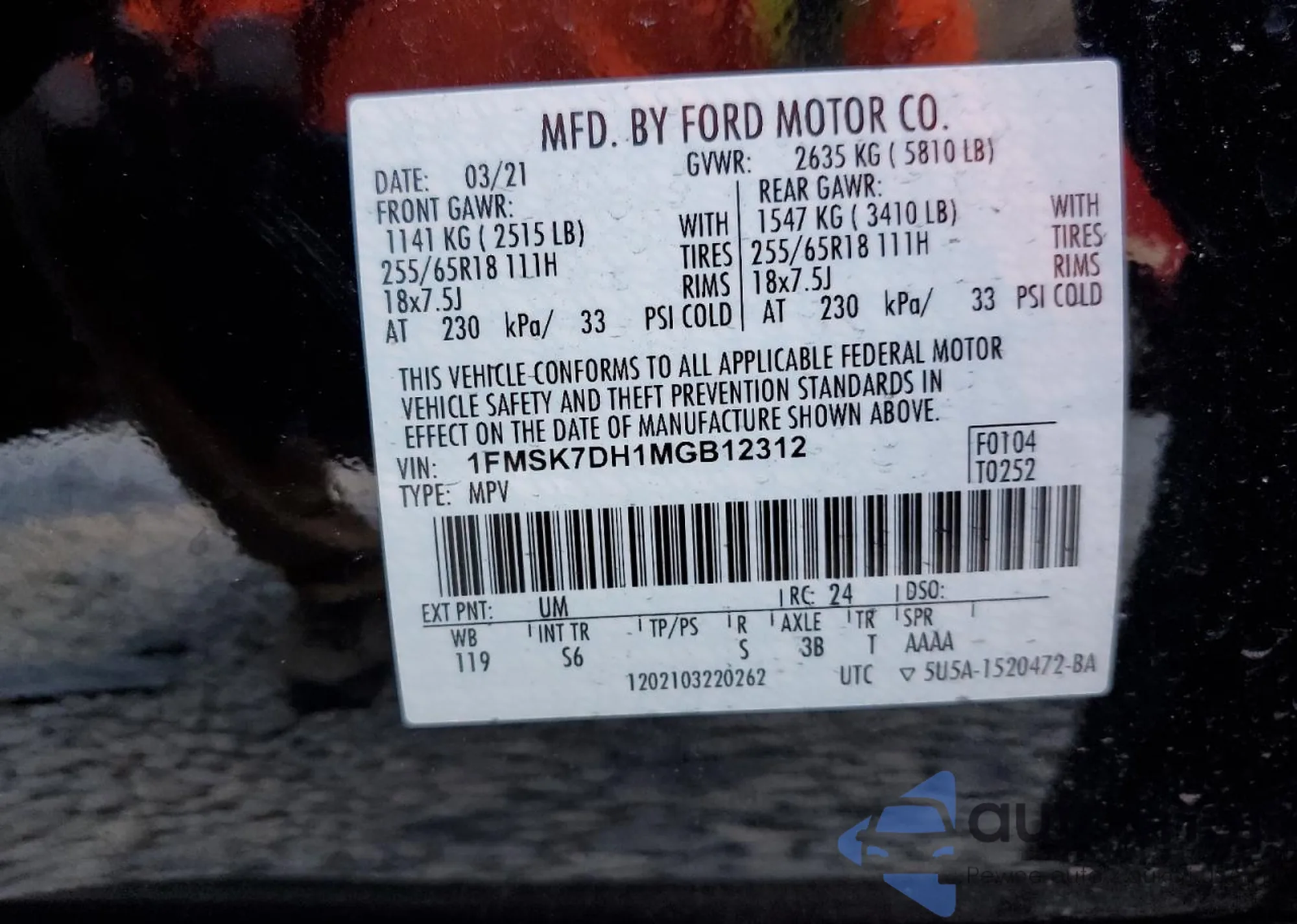 LOT: 63828662 VIN: 1FMSK7DH1MGB12312