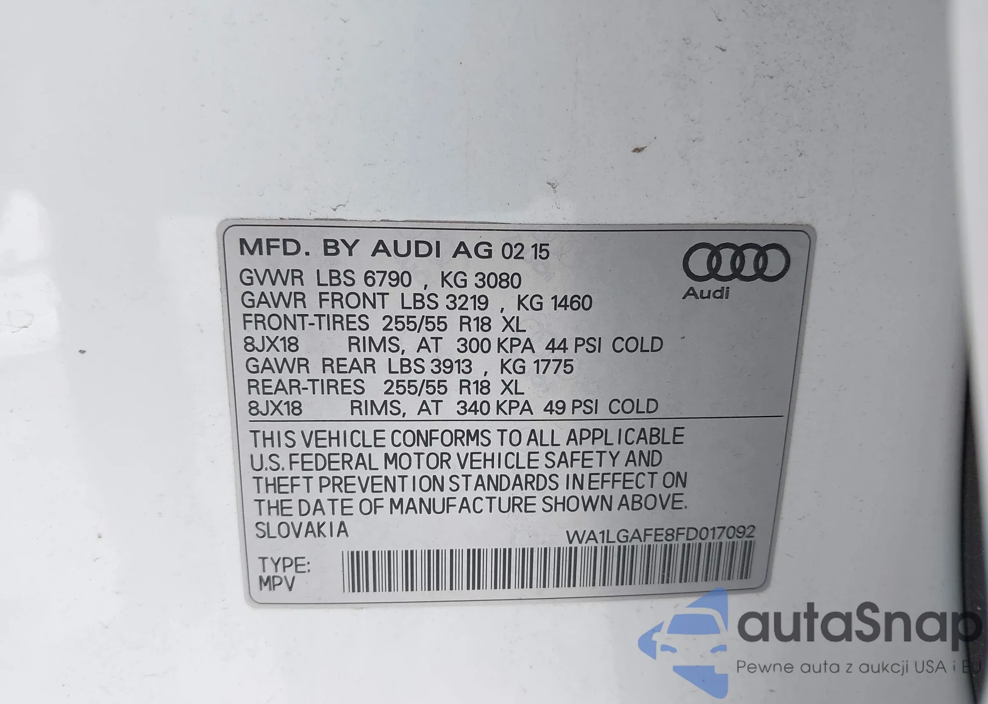 LOT: 42073593 VIN: WA1LGAFE8FD017092