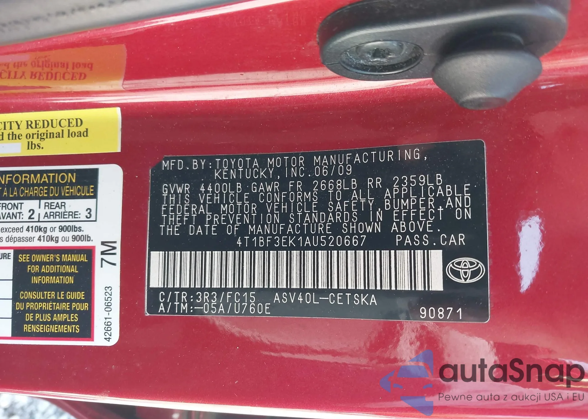 LOT: 42209539 VIN: 4T1BF3EK1AU520667