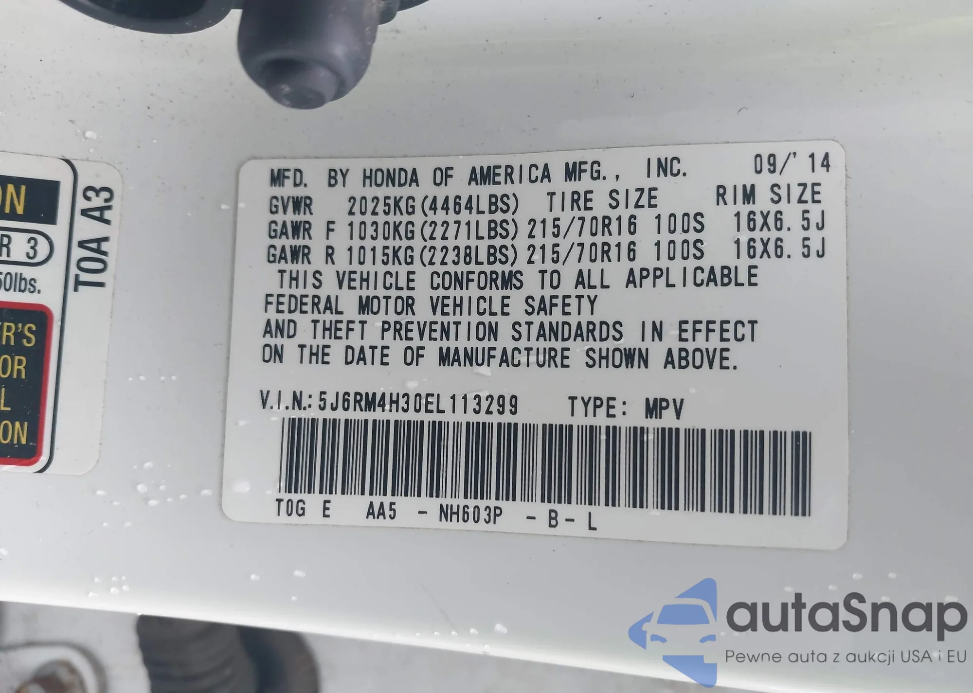 • VIN 5J6RM4H30EL113299