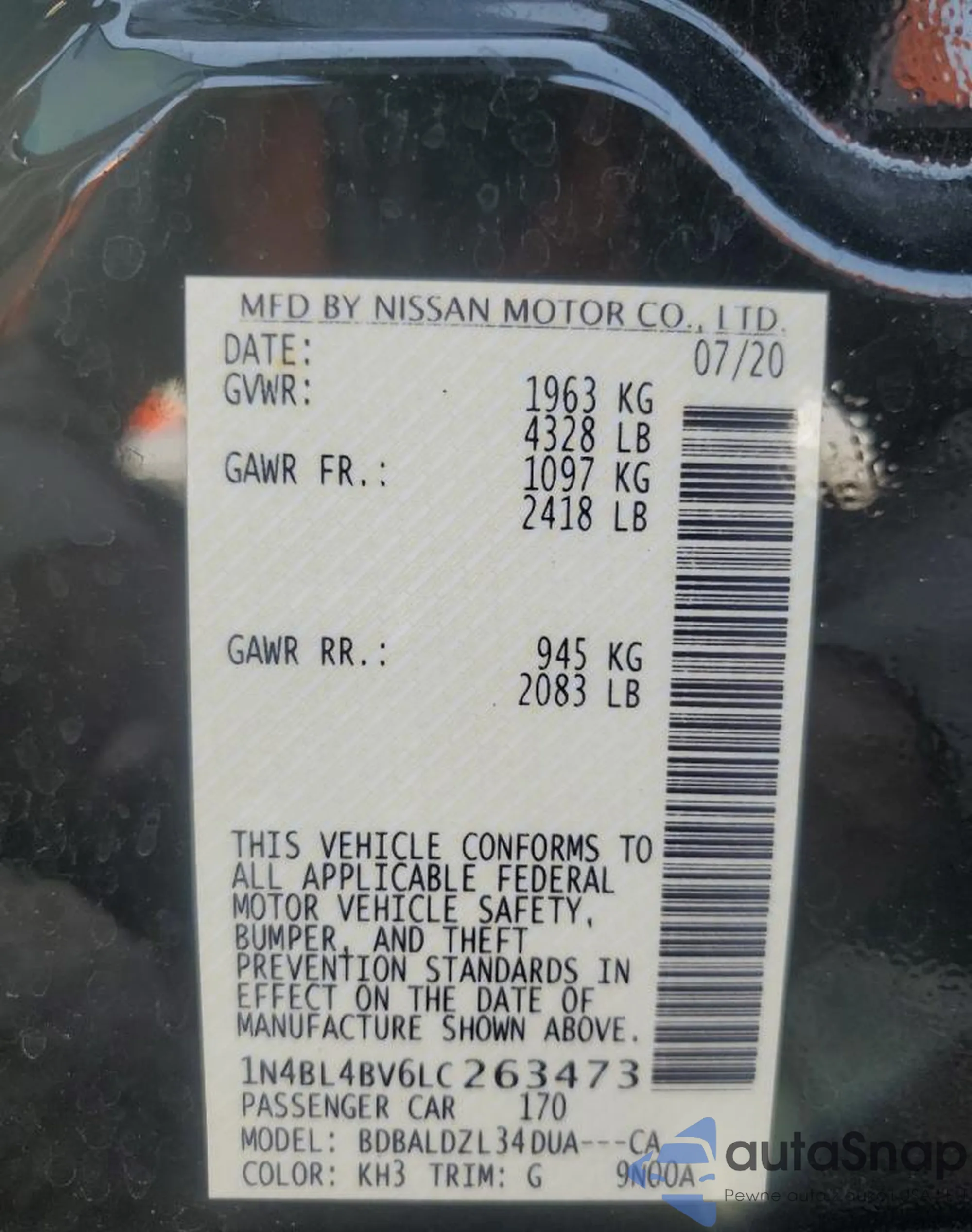 • VIN 1N4BL4BV6LC263473