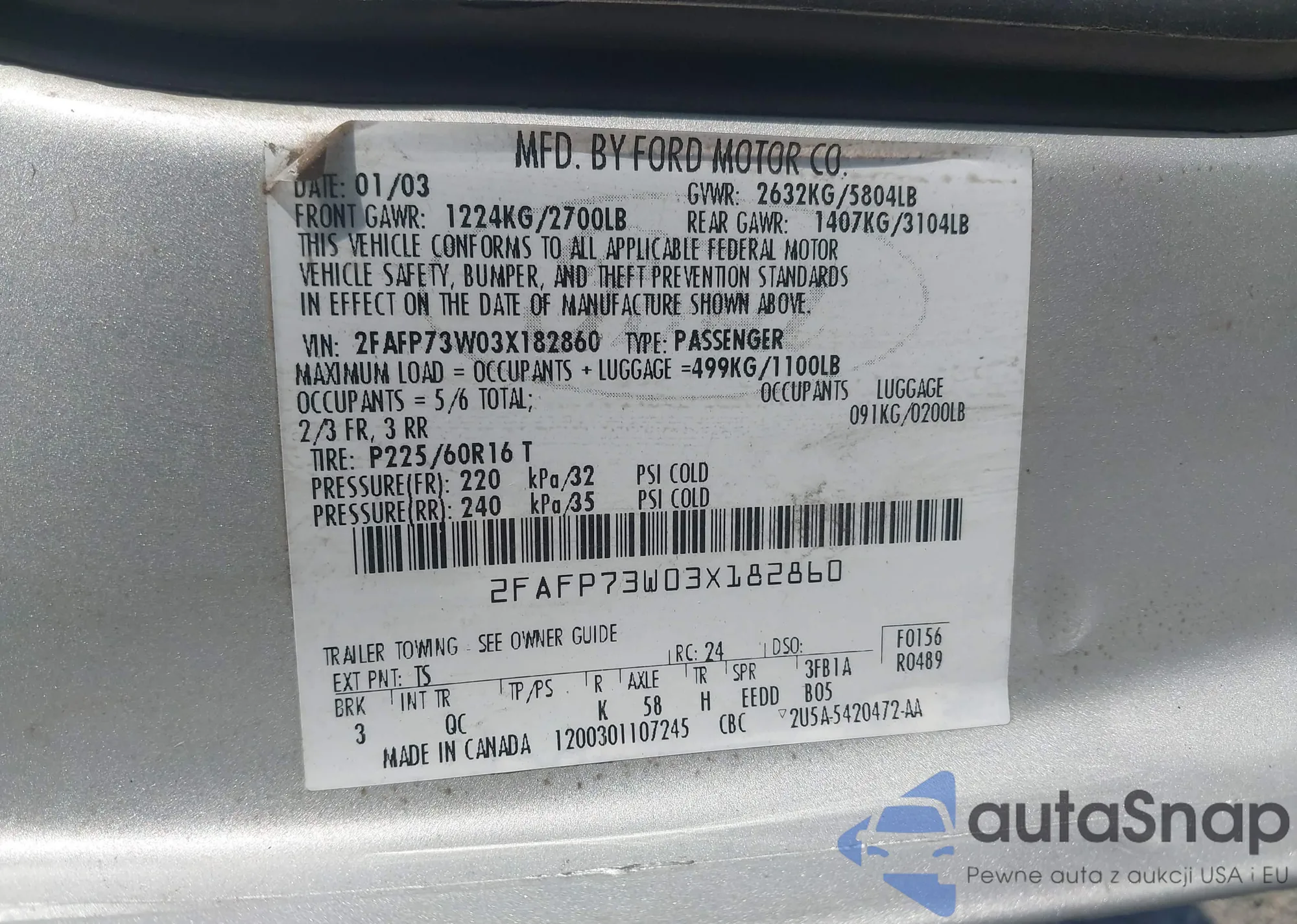 LOT: 42479350 VIN: 2FAFP73W03X182860