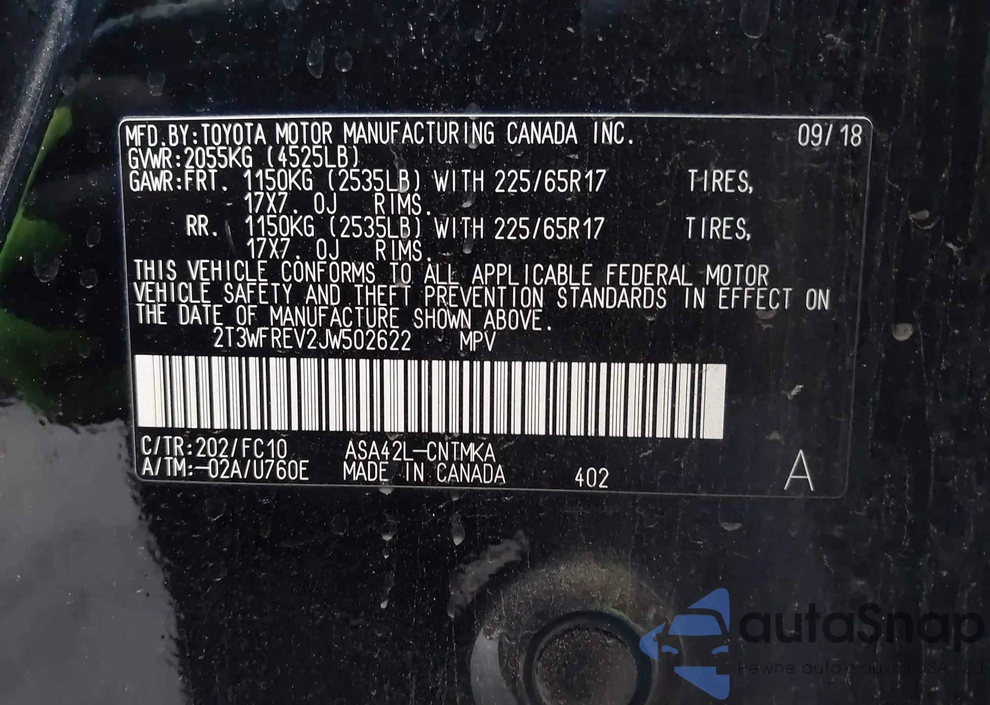 LOT: 42327598 VIN: 2T3WFREV2JW502622