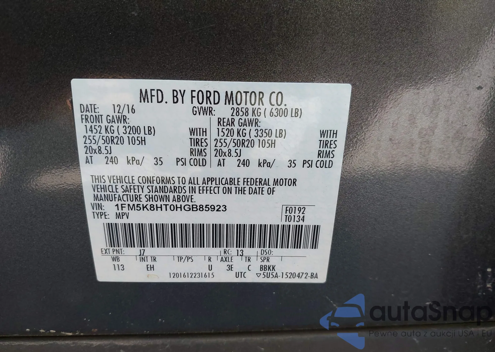 LOT: 42399738 VIN: 1FM5K8HT0HGB85923