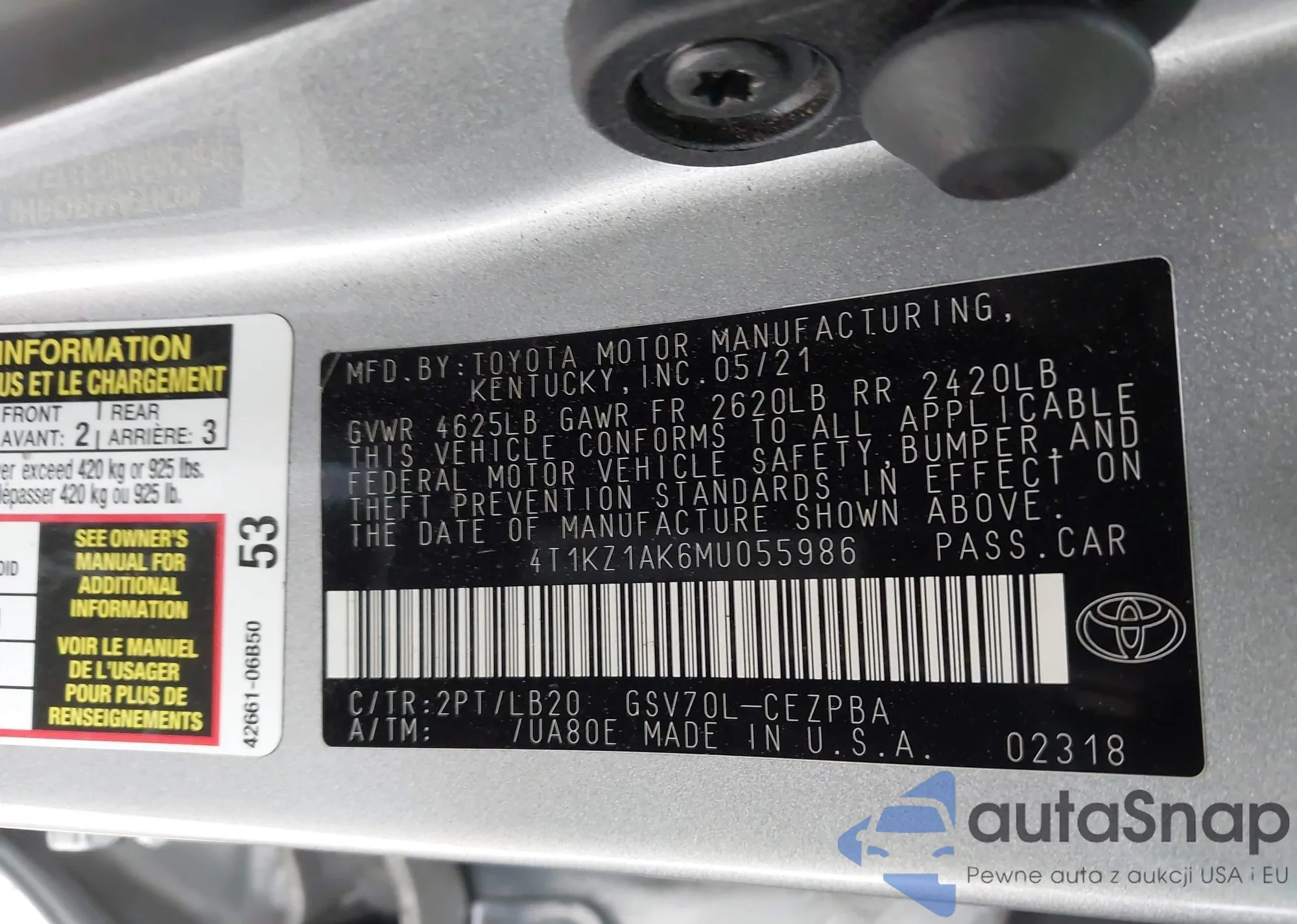 LOT: 42410896 VIN: 4T1KZ1AK6MU055986