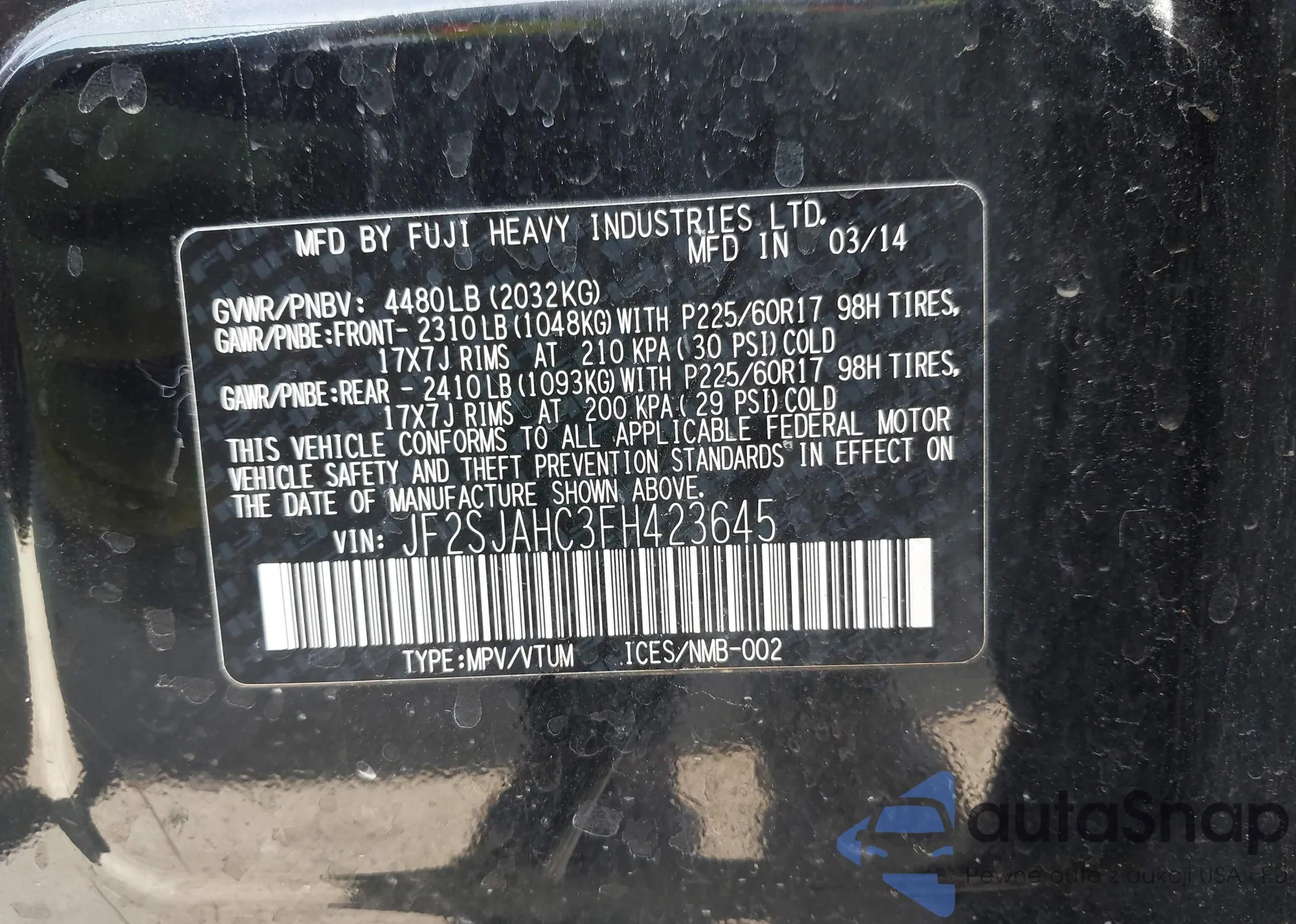 • VIN JF2SJAHC3FH423645