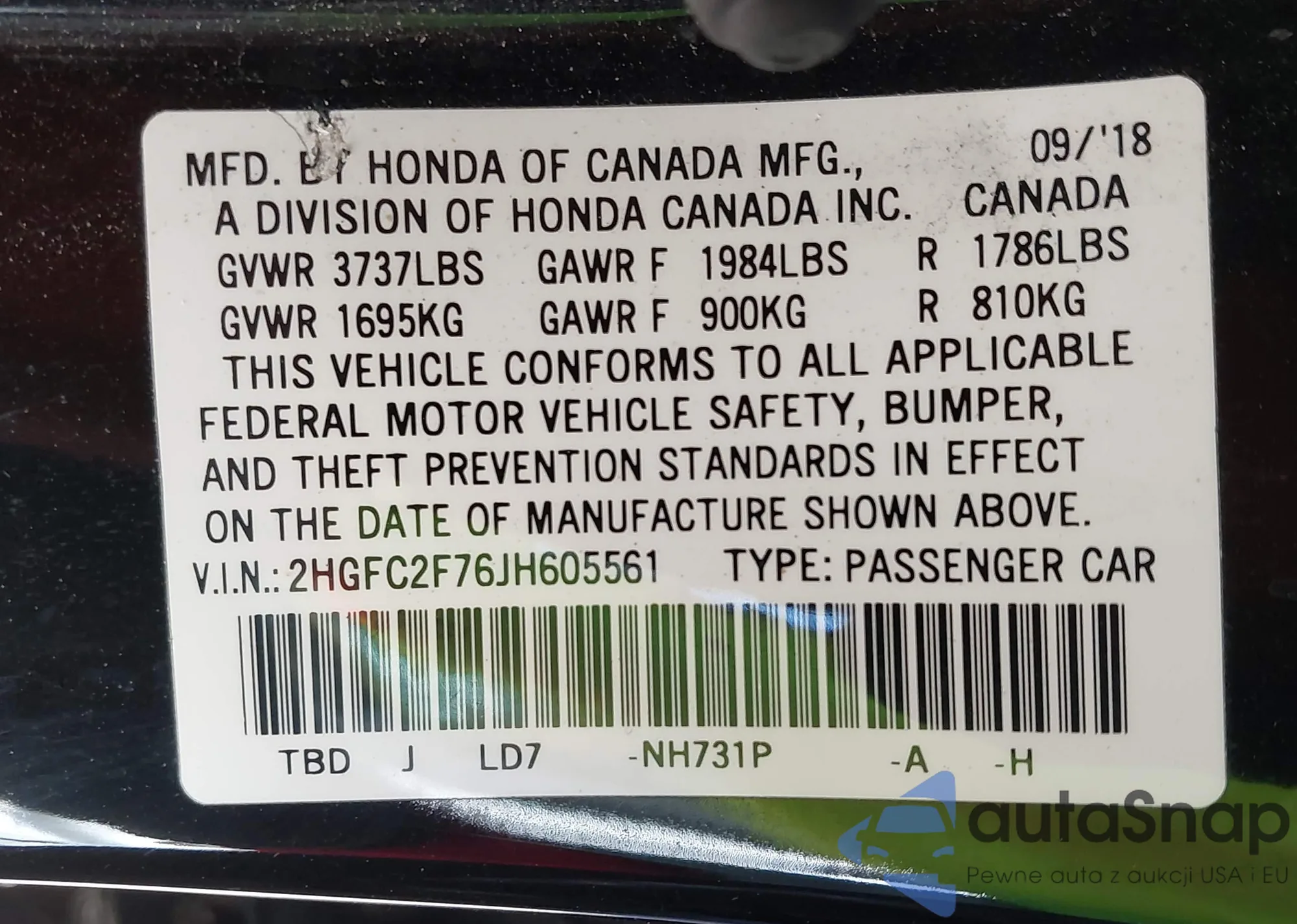 • VIN 2HGFC2F76JH605561