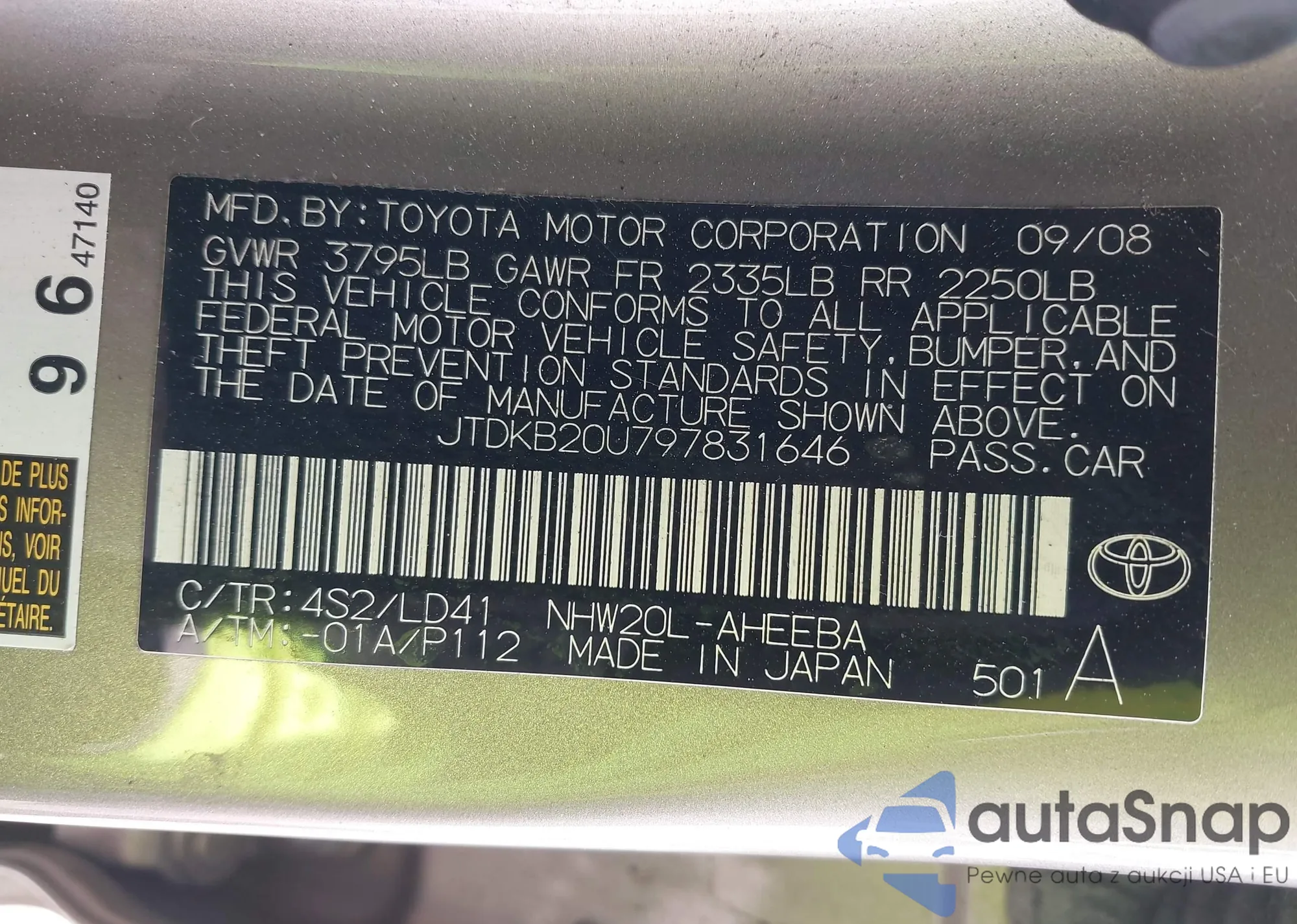 LOT: 42562990 VIN: JTDKB20U797831646