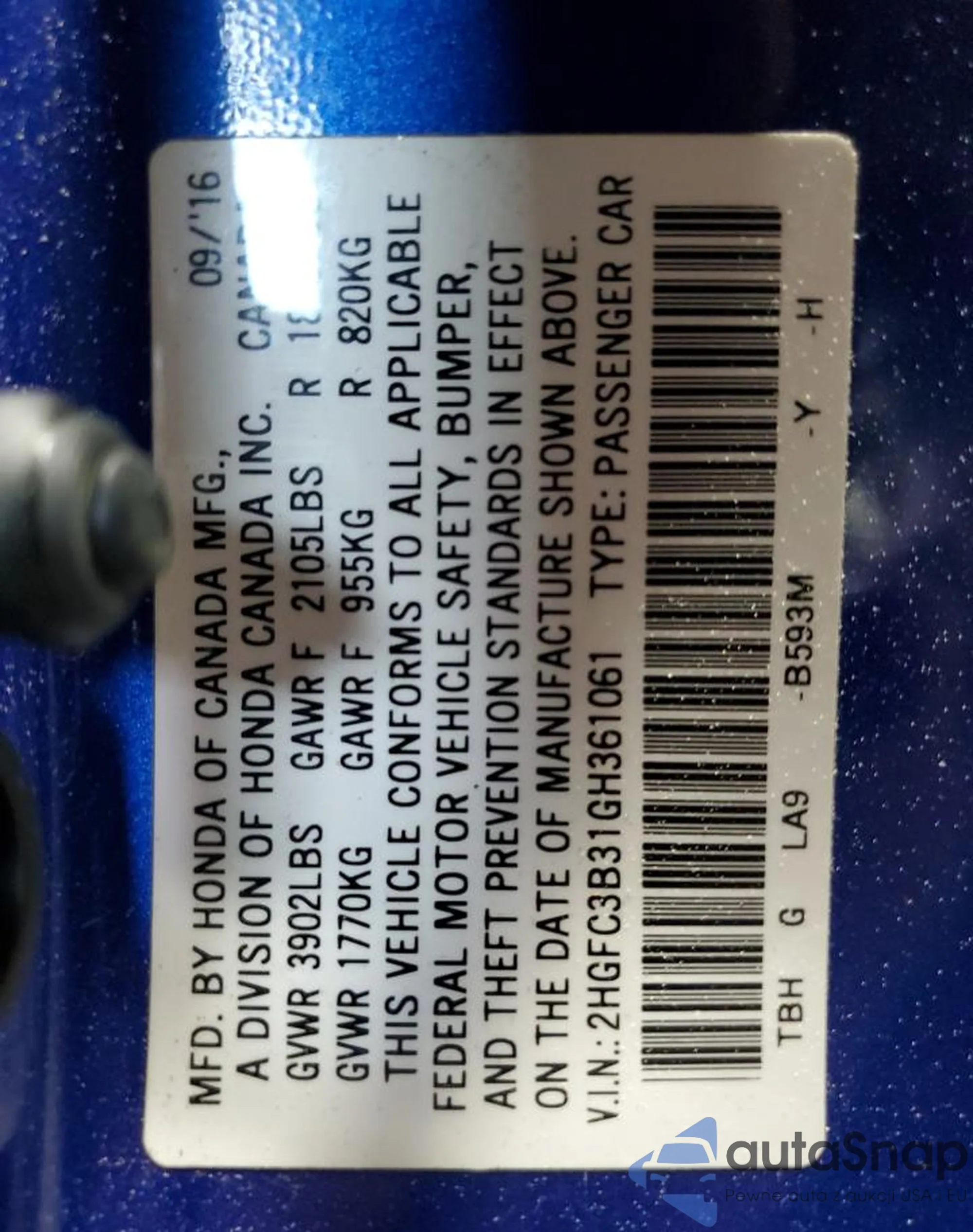 LOT: 56869105 VIN: 2HGFC3B31GH361061
