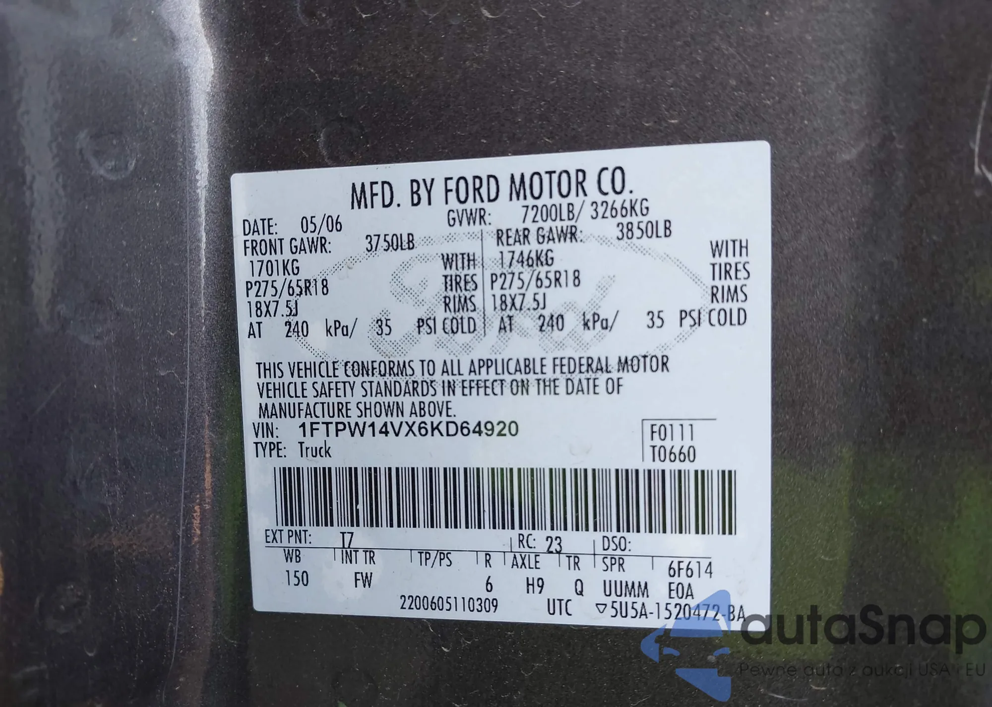 • VIN 1FTPW14VX6KD64920