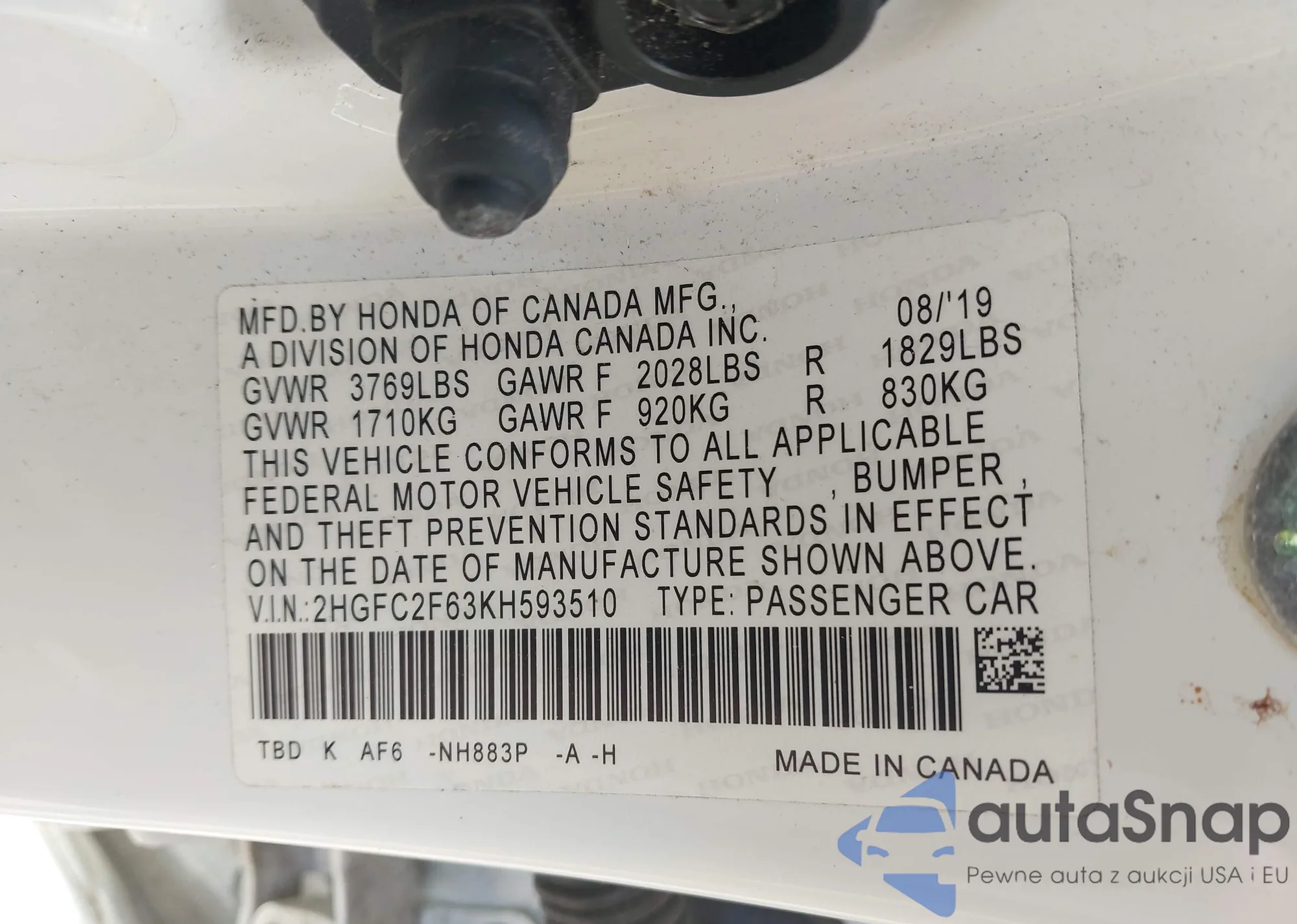 • VIN 2HGFC2F63KH593510