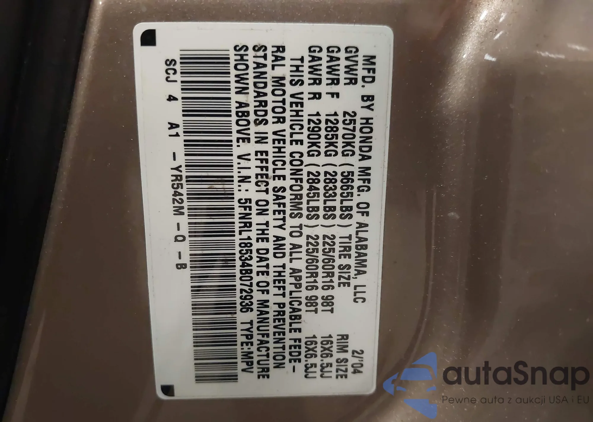 • VIN 5FNRL18534B072936