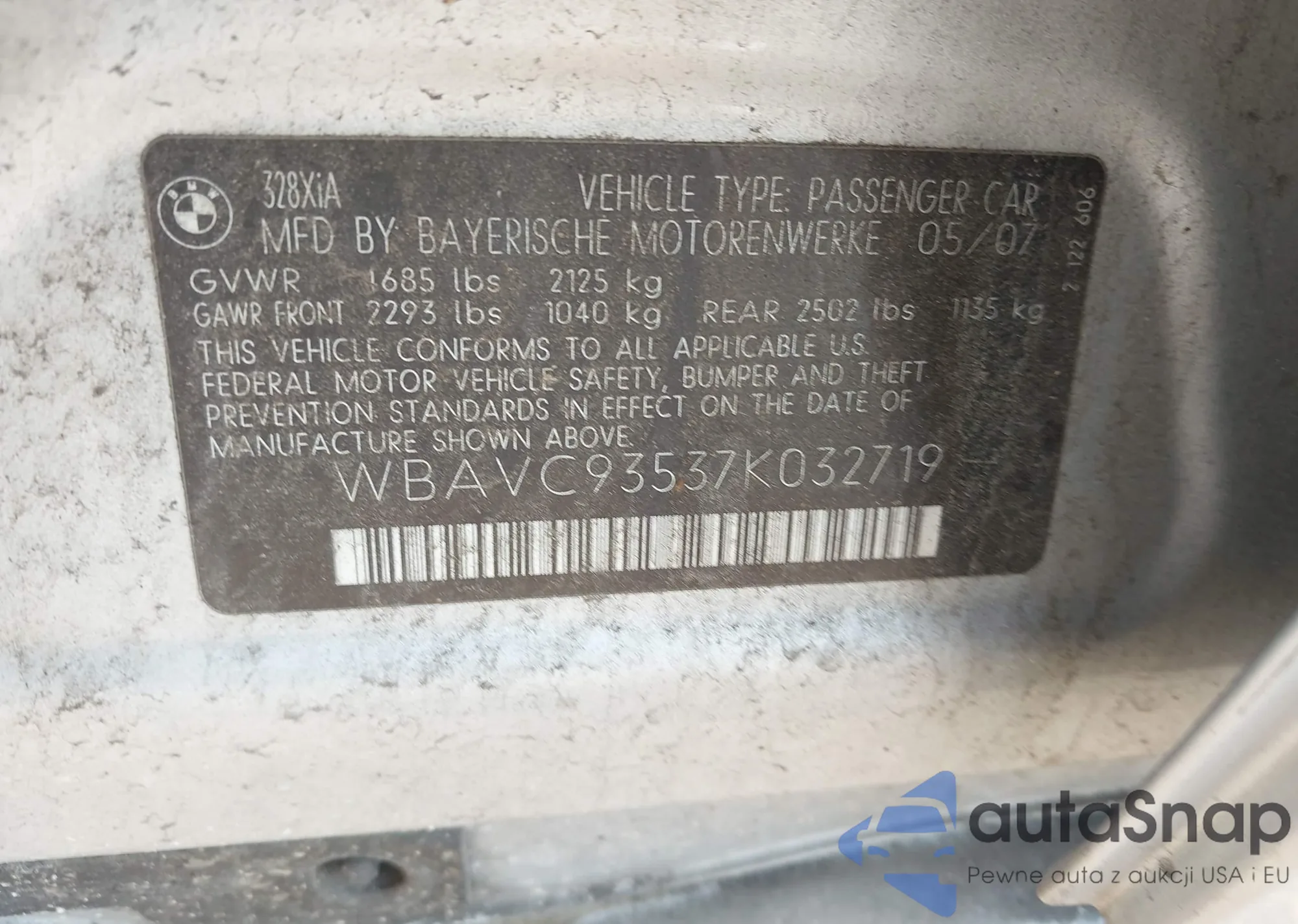 2007 BMW 328Xi z USA, uszkodzony, nr VIN WBAVC93537K032719
