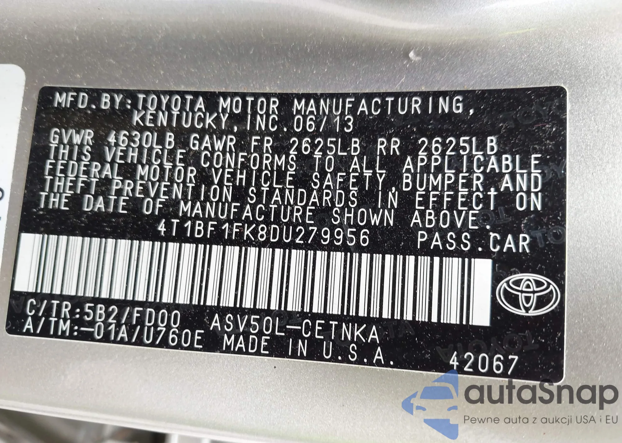 LOT: 42601847 VIN: 4T1BF1FK8DU279956