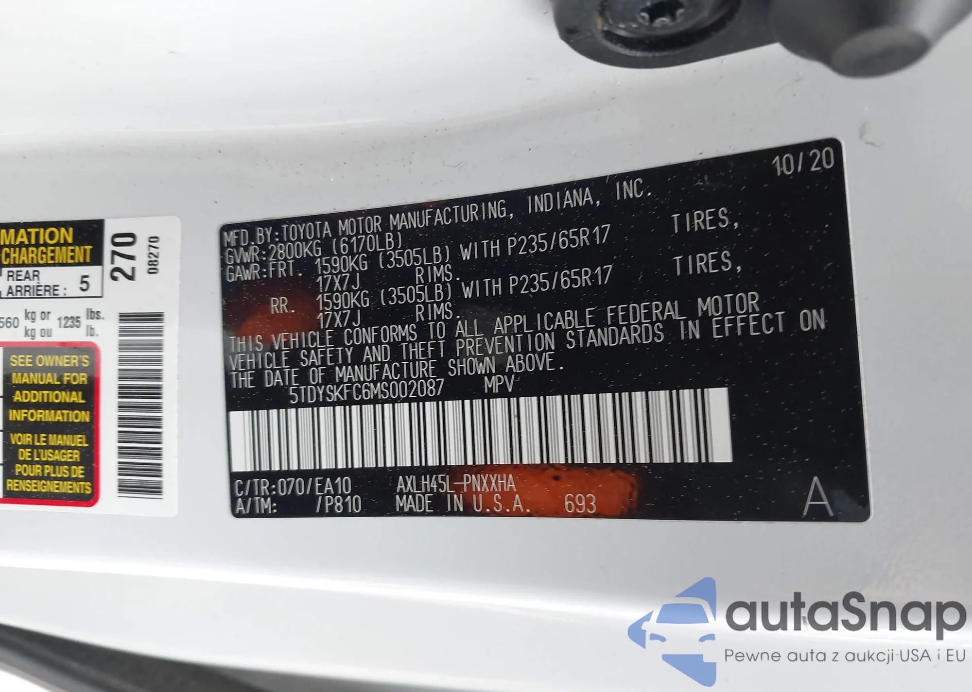 LOT: 42182937 VIN: 5TDYSKFC6MS002087