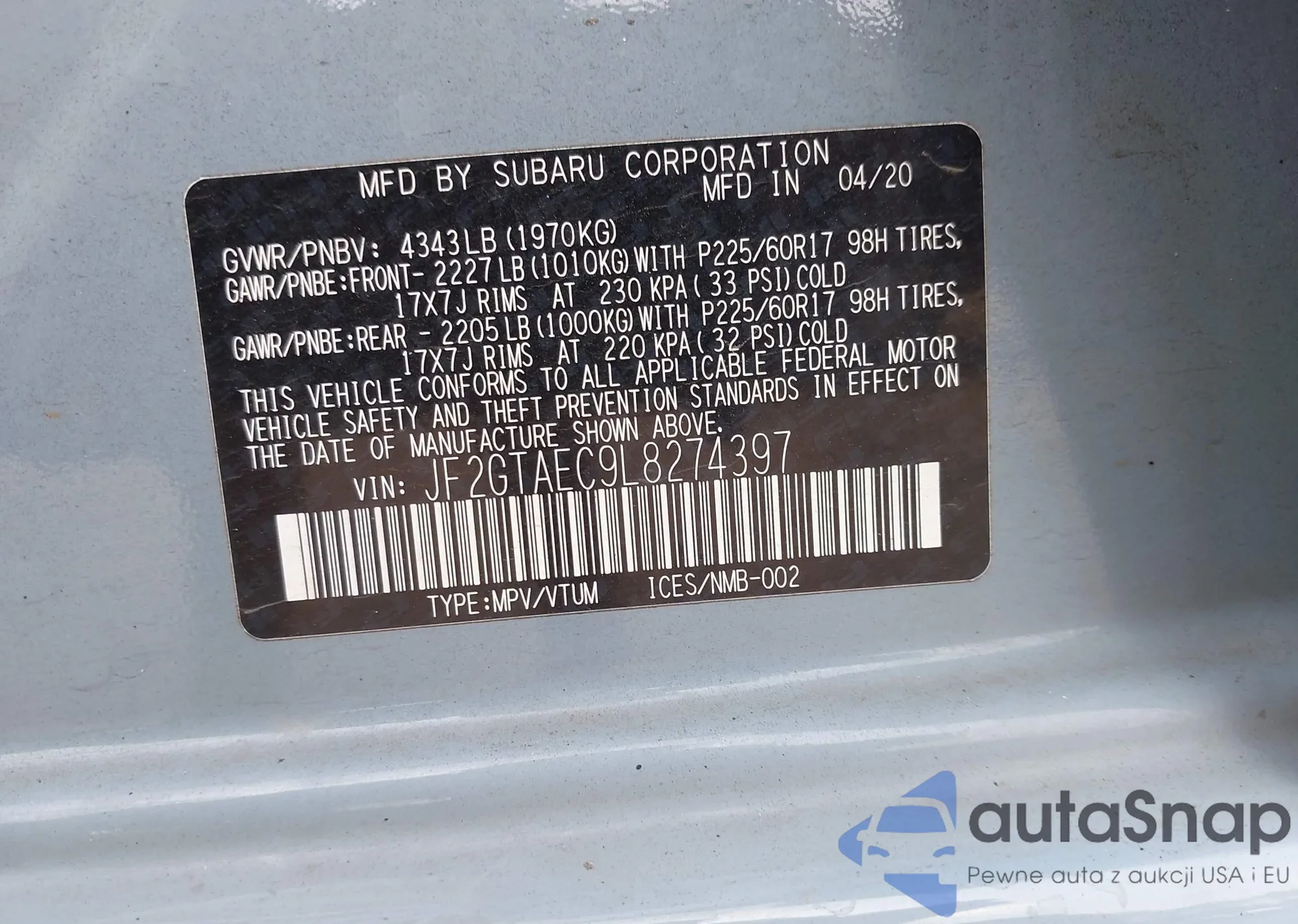 LOT: 42192877 VIN: JF2GTAEC9L8274397