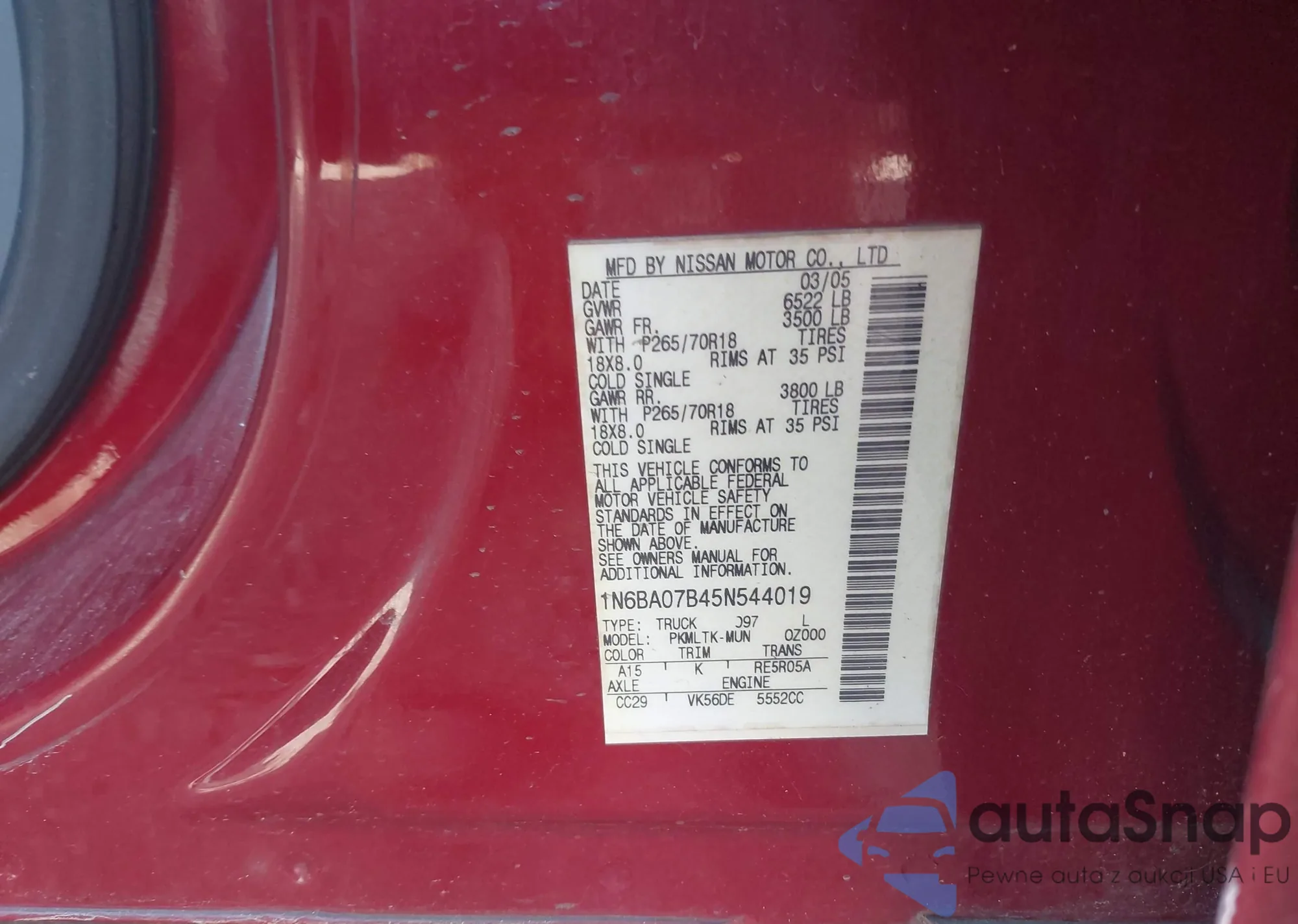2005 Nissan Titan Se z USA, uszkodzony, nr VIN 1N6BA07B45N544019