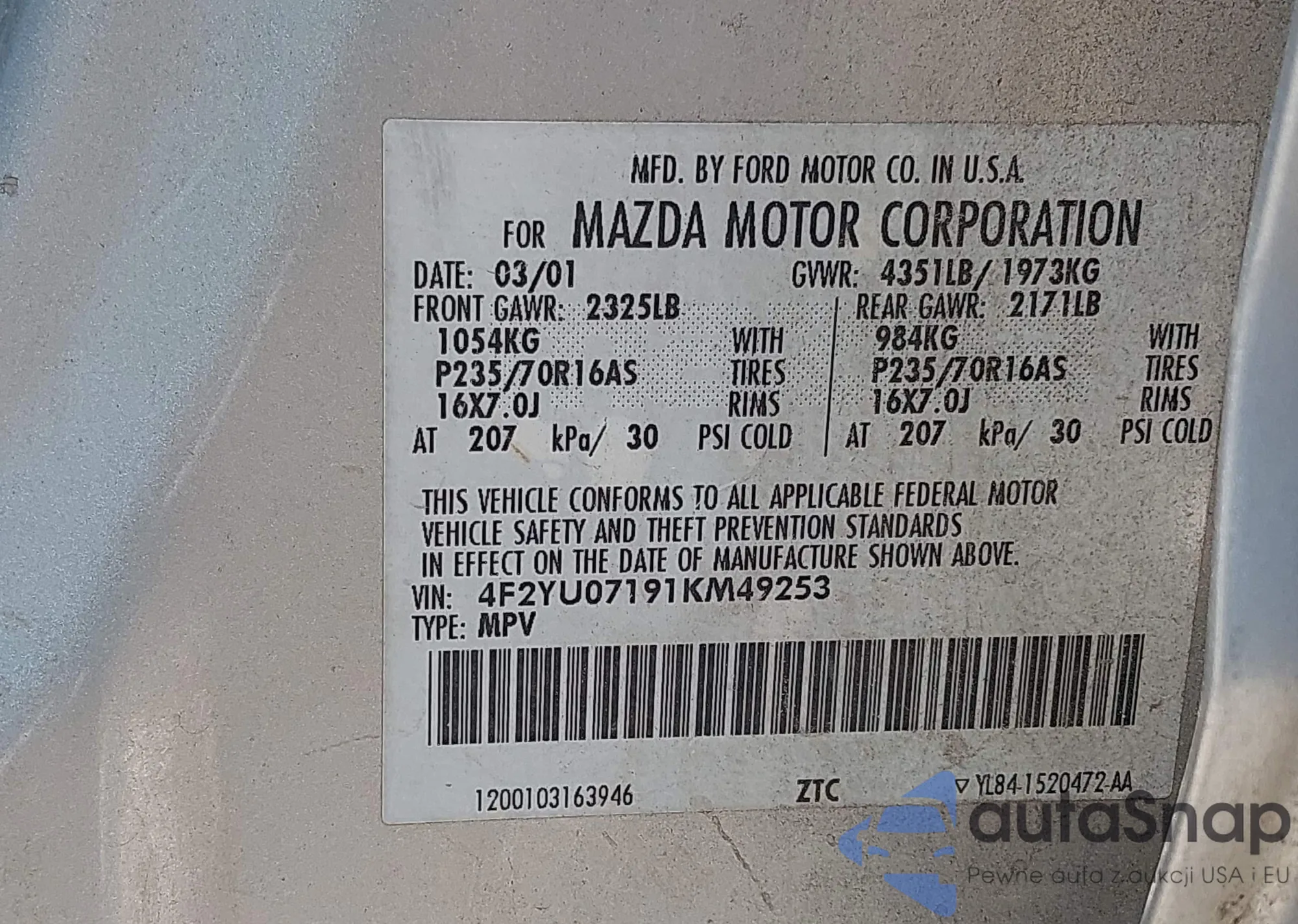 • VIN 4F2YU07191KM49253