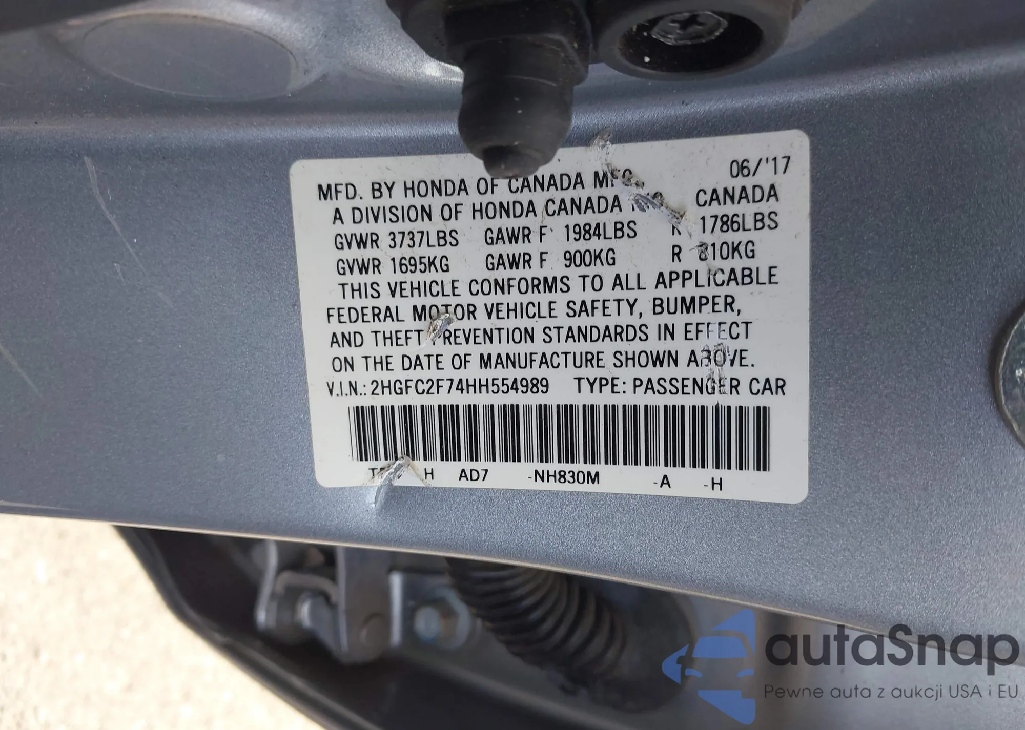 LOT: 42121367 VIN: 2HGFC2F74HH554989