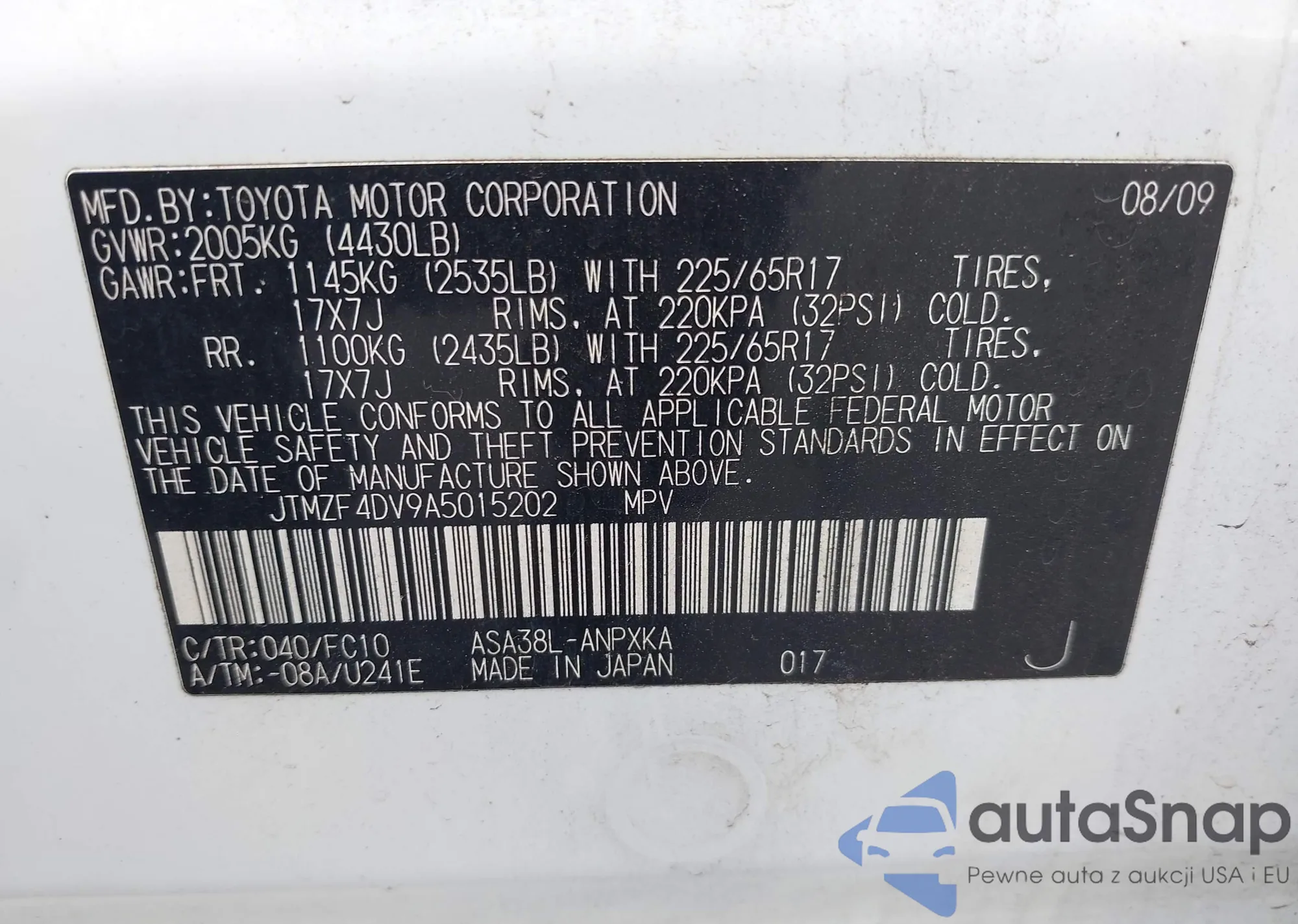 LOT: 42173760 VIN: JTMZF4DV9A5015202