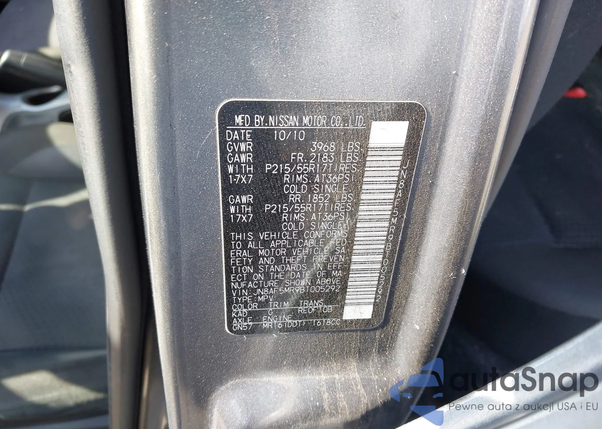 LOT: 42238224 VIN: JN8AF5MR9BT005292