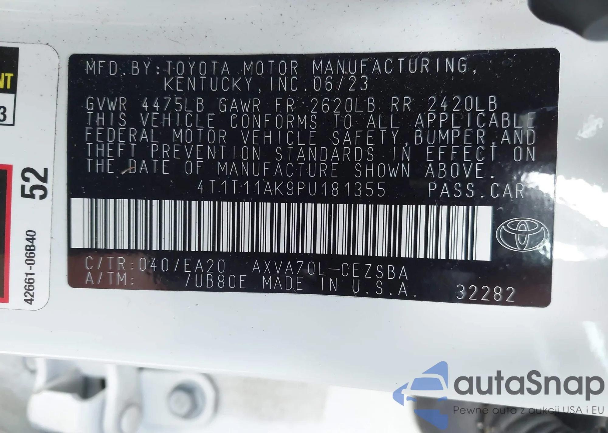 LOT: 41623660 VIN: 4T1T11AK9PU181355