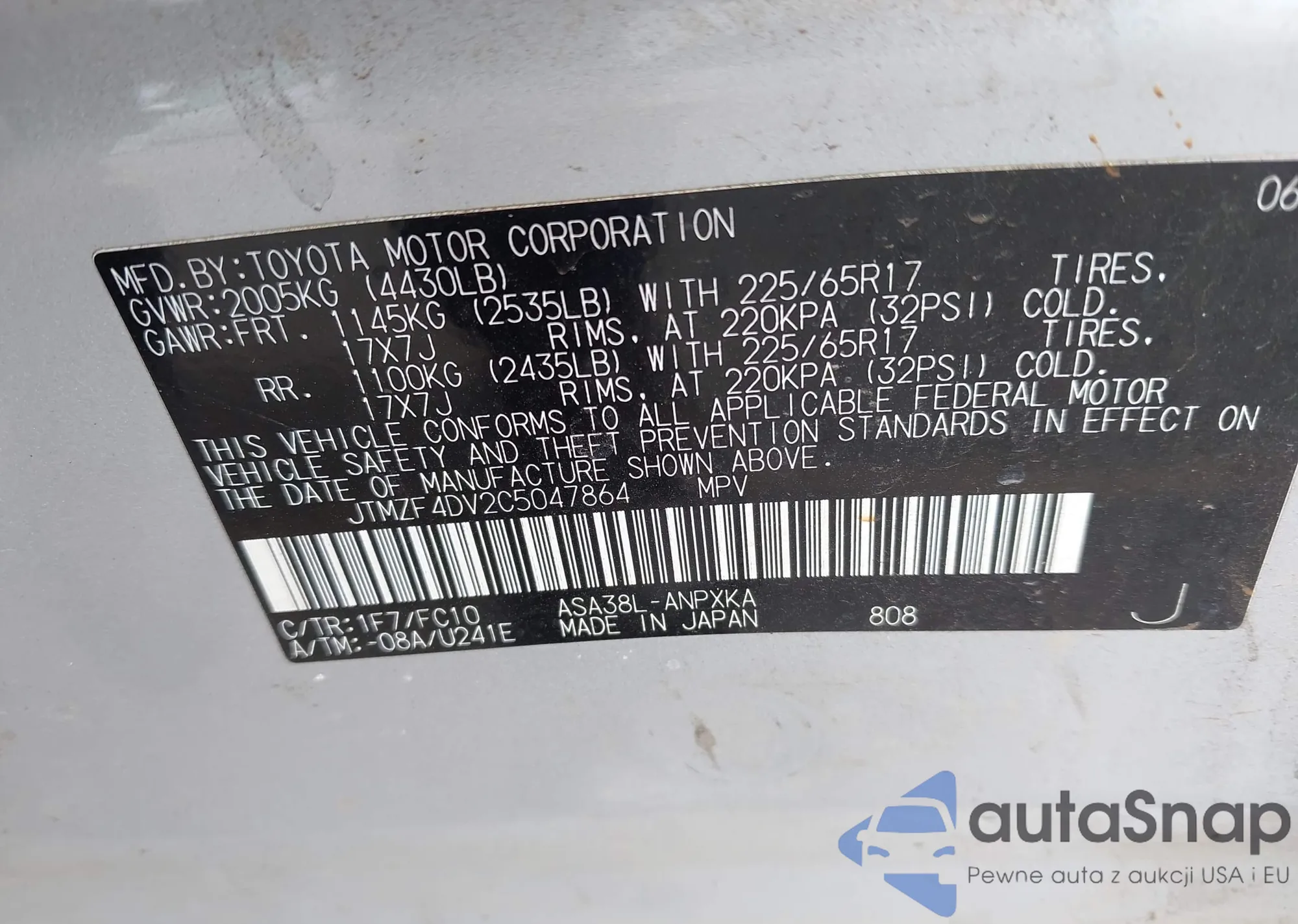 LOT: 42175545 VIN: JTMZF4DV2C5047864