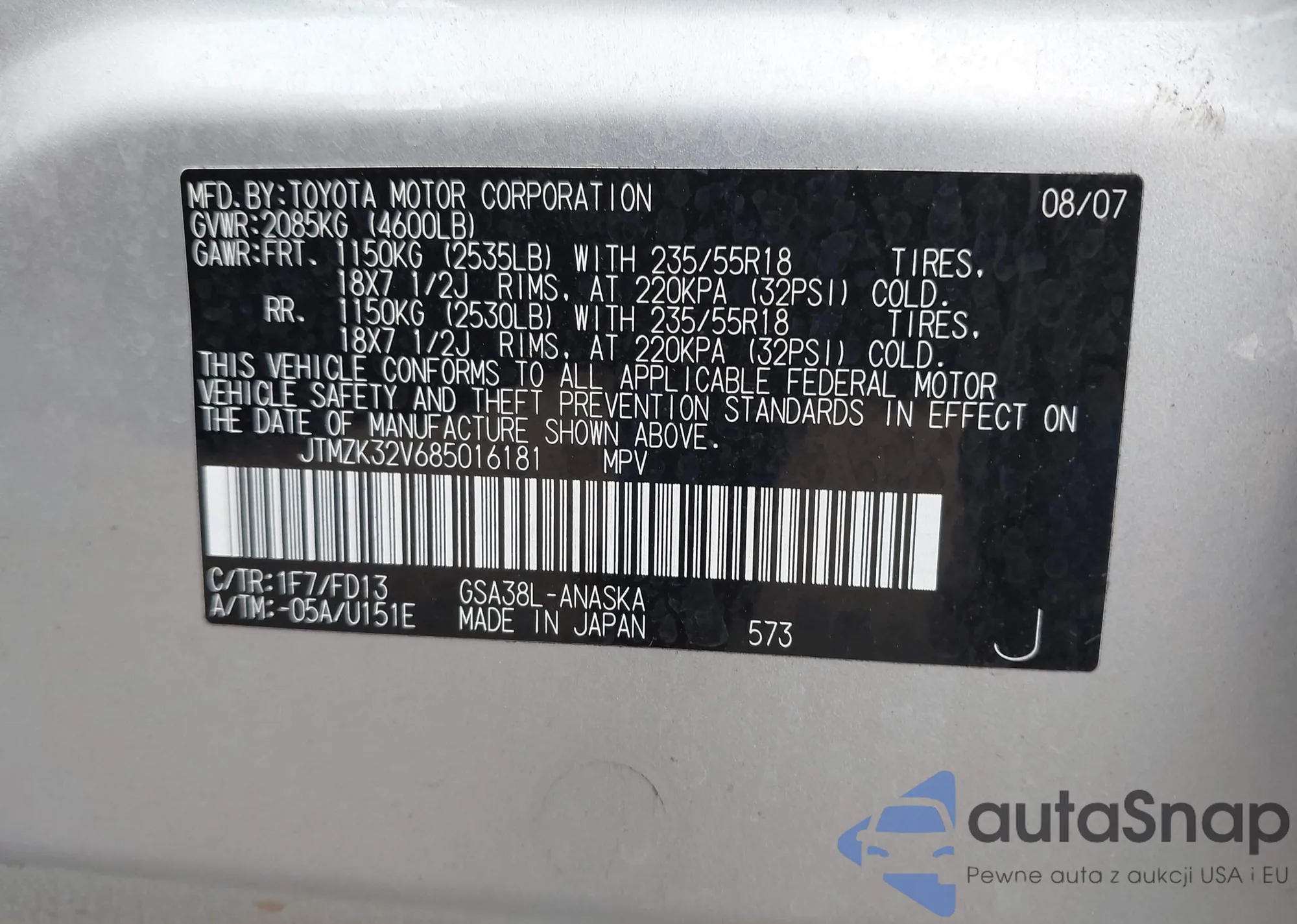 LOT: 42194844 VIN: JTMZK32V685016181