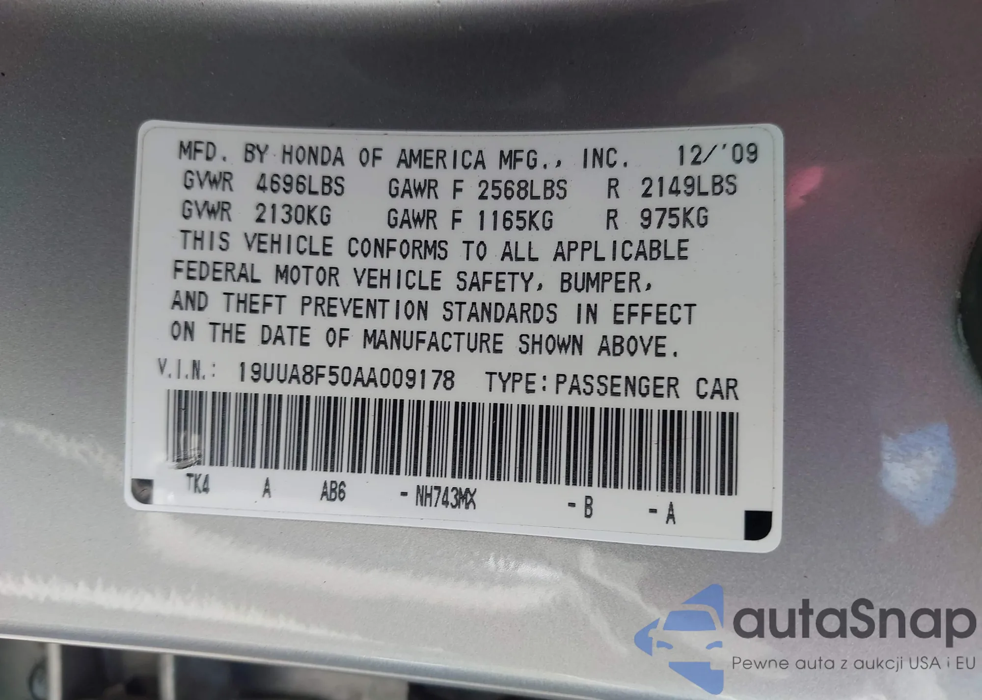 • VIN 19UUA8F50AA009178