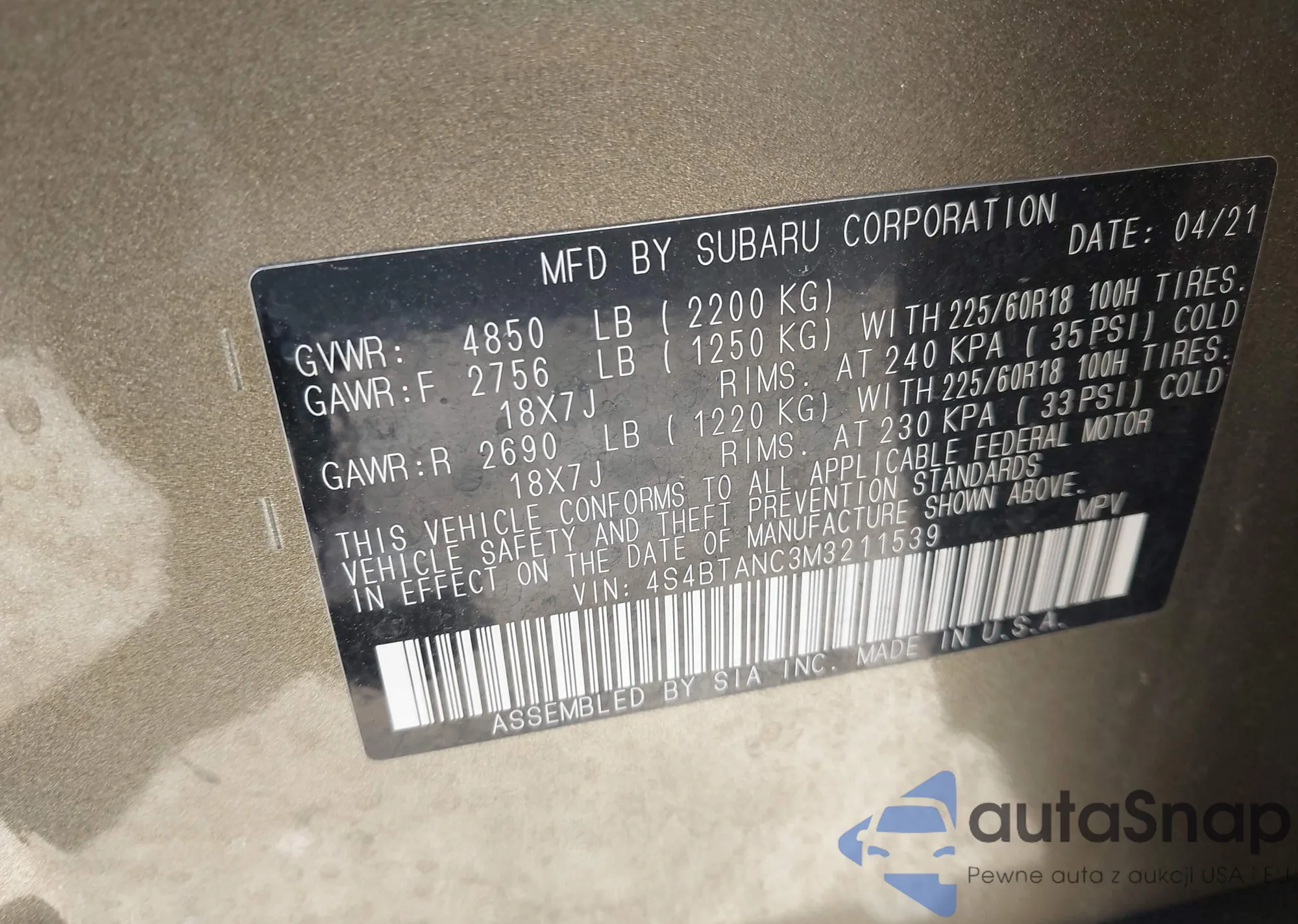 LOT: 42234090 VIN: 4S4BTANC3M3211539