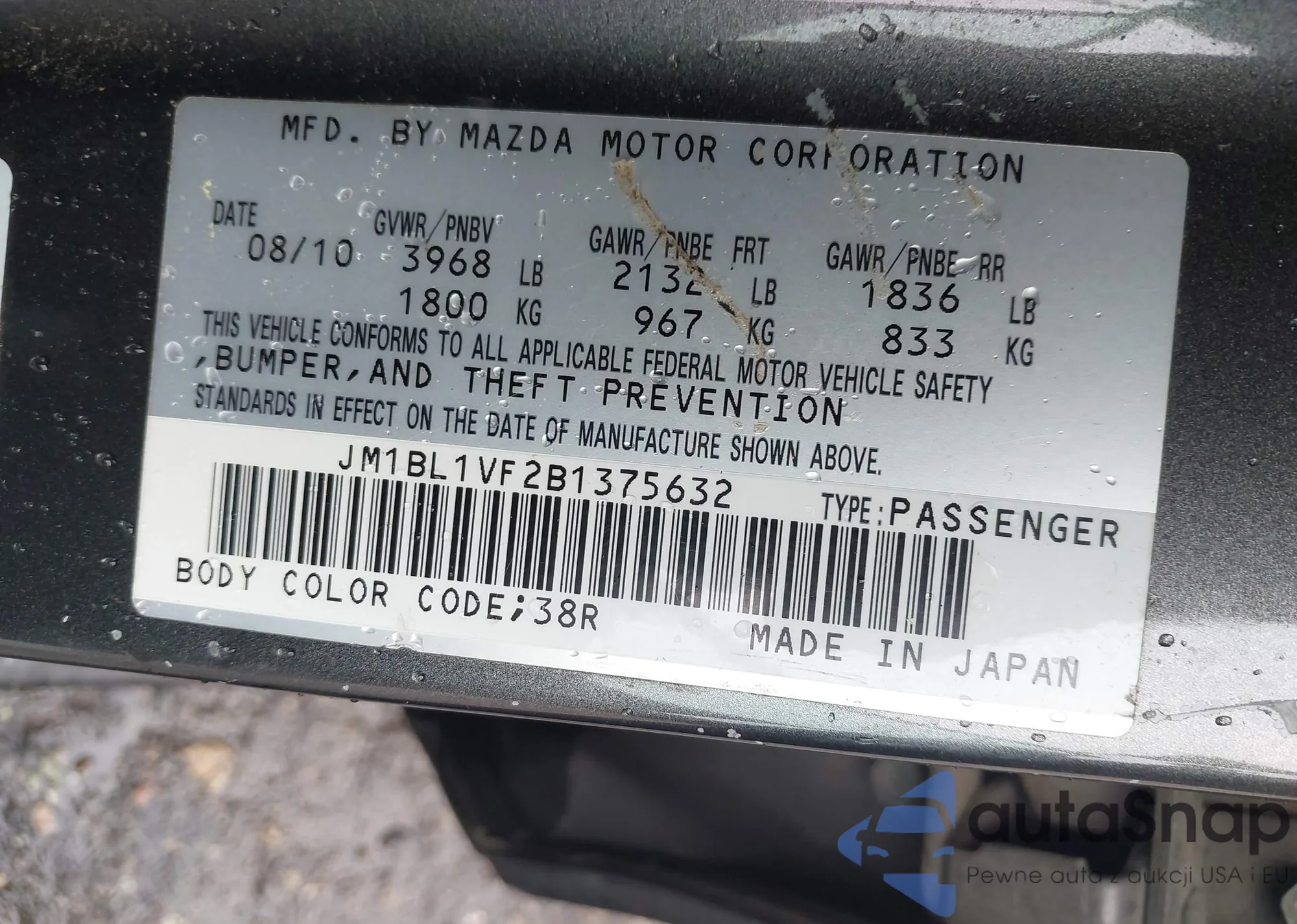 LOT: 42347760 VIN: JM1BL1VF2B1375632