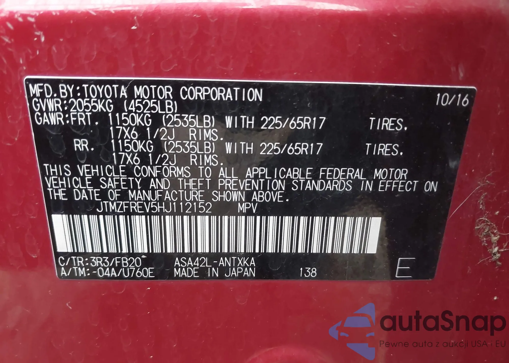 LOT: 42355622 VIN: JTMZFREV5HJ112152