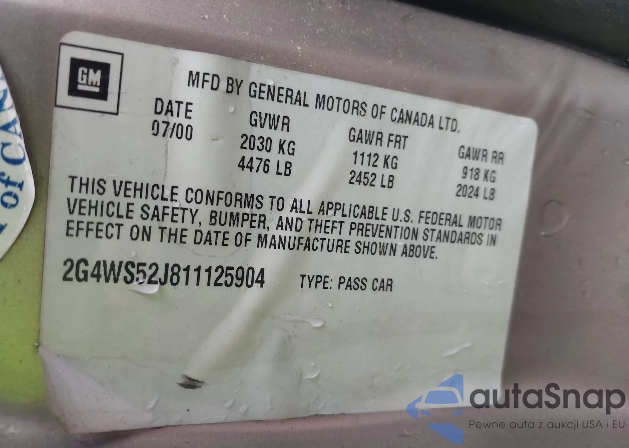 LOT: 42365404 VIN: 2G4WS52J811125904