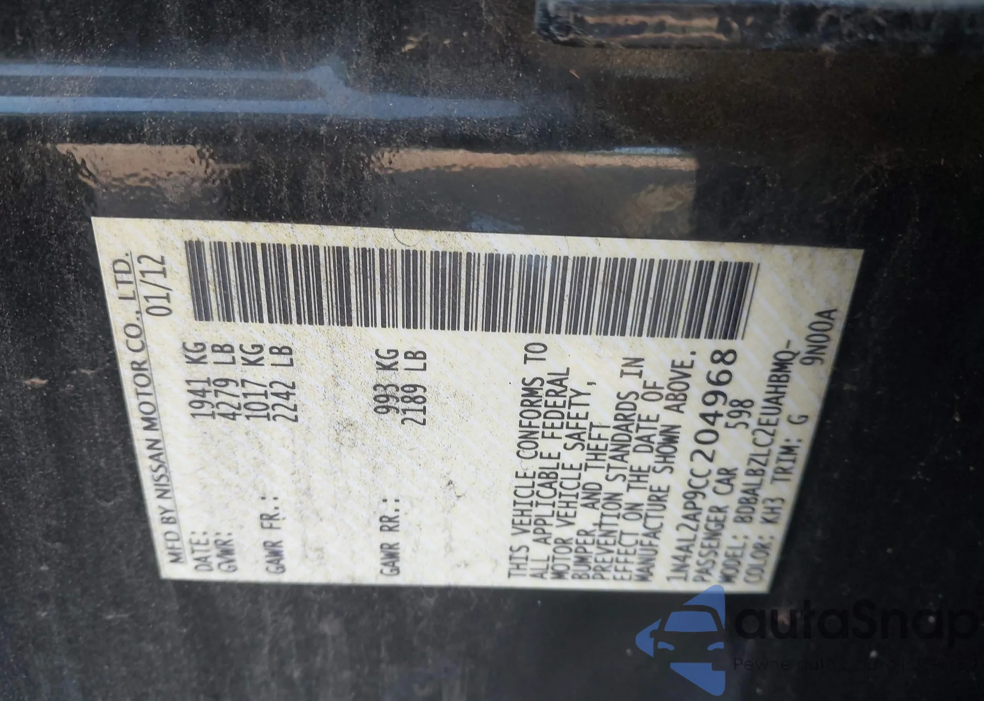LOT: 42610242 VIN: 1N4AL2AP9CC204968