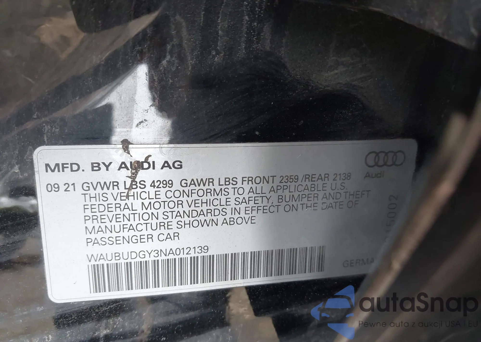 • VIN WAUBUDGY3NA012139