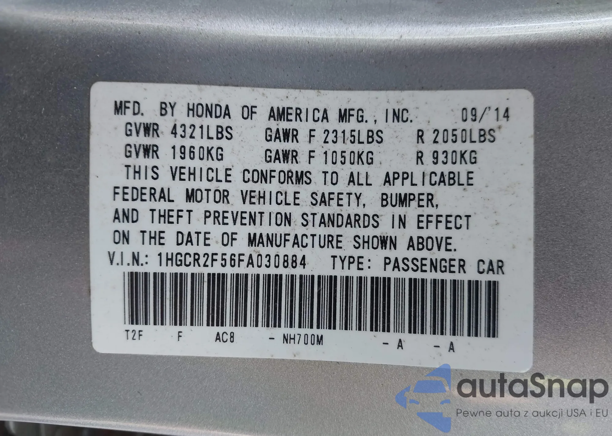 LOT: 41110449 VIN: 1HGCR2F56FA030884