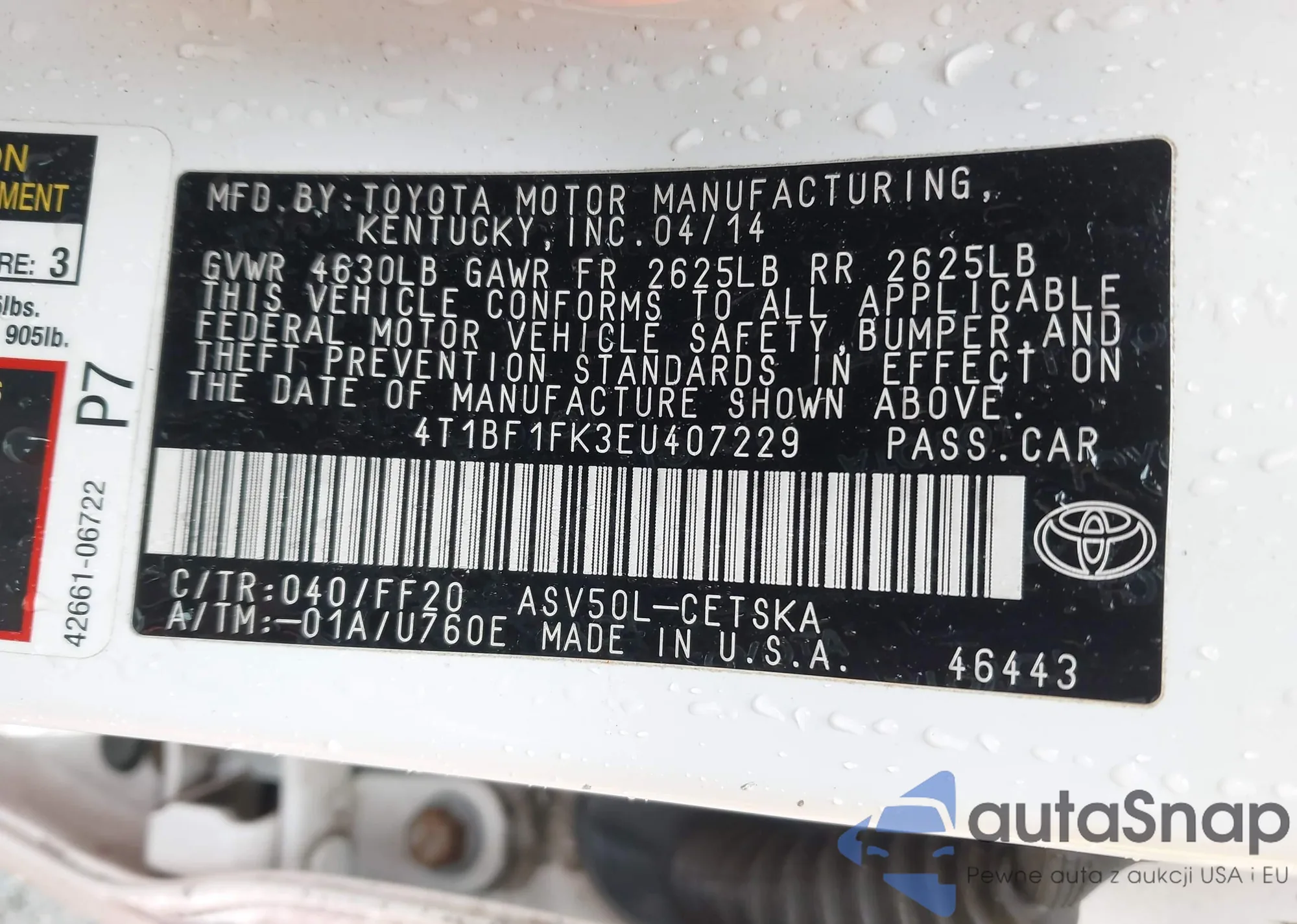 • VIN 4T1BF1FK3EU407229
