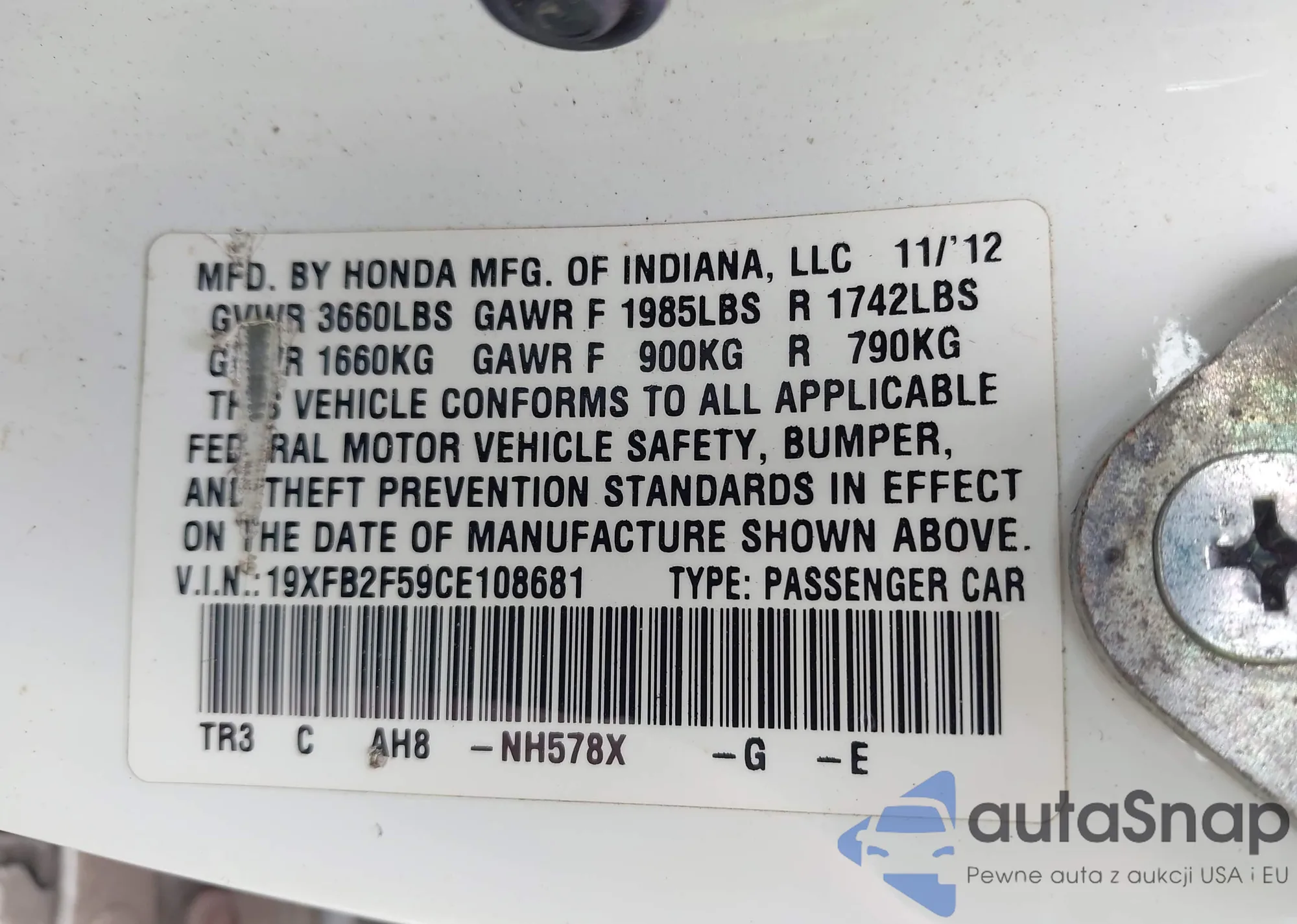 LOT: 42179423 VIN: 19XFB2F59CE108681