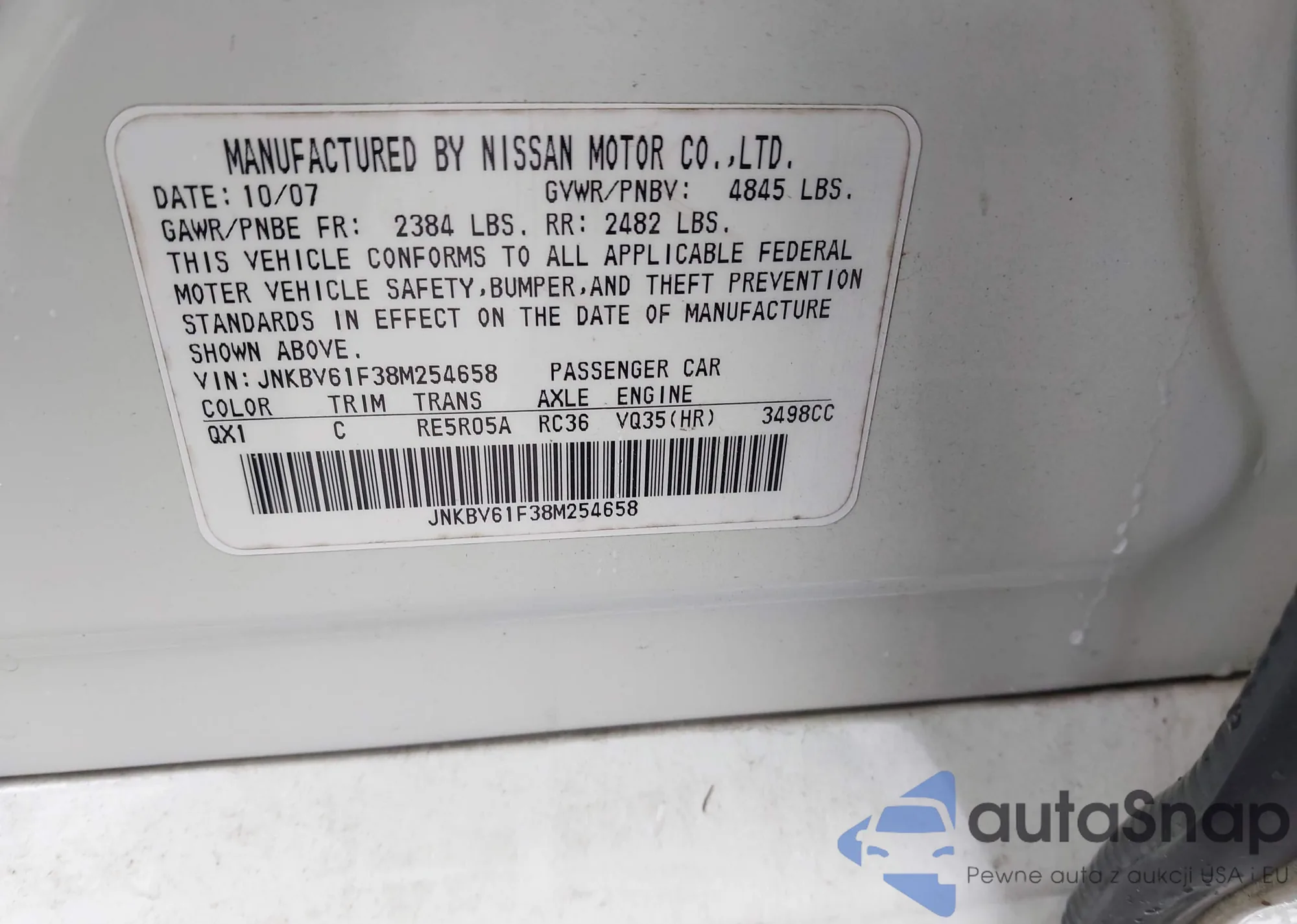 2008 Infiniti G35X z USA, uszkodzony, nr VIN JNKBV61F38M254658