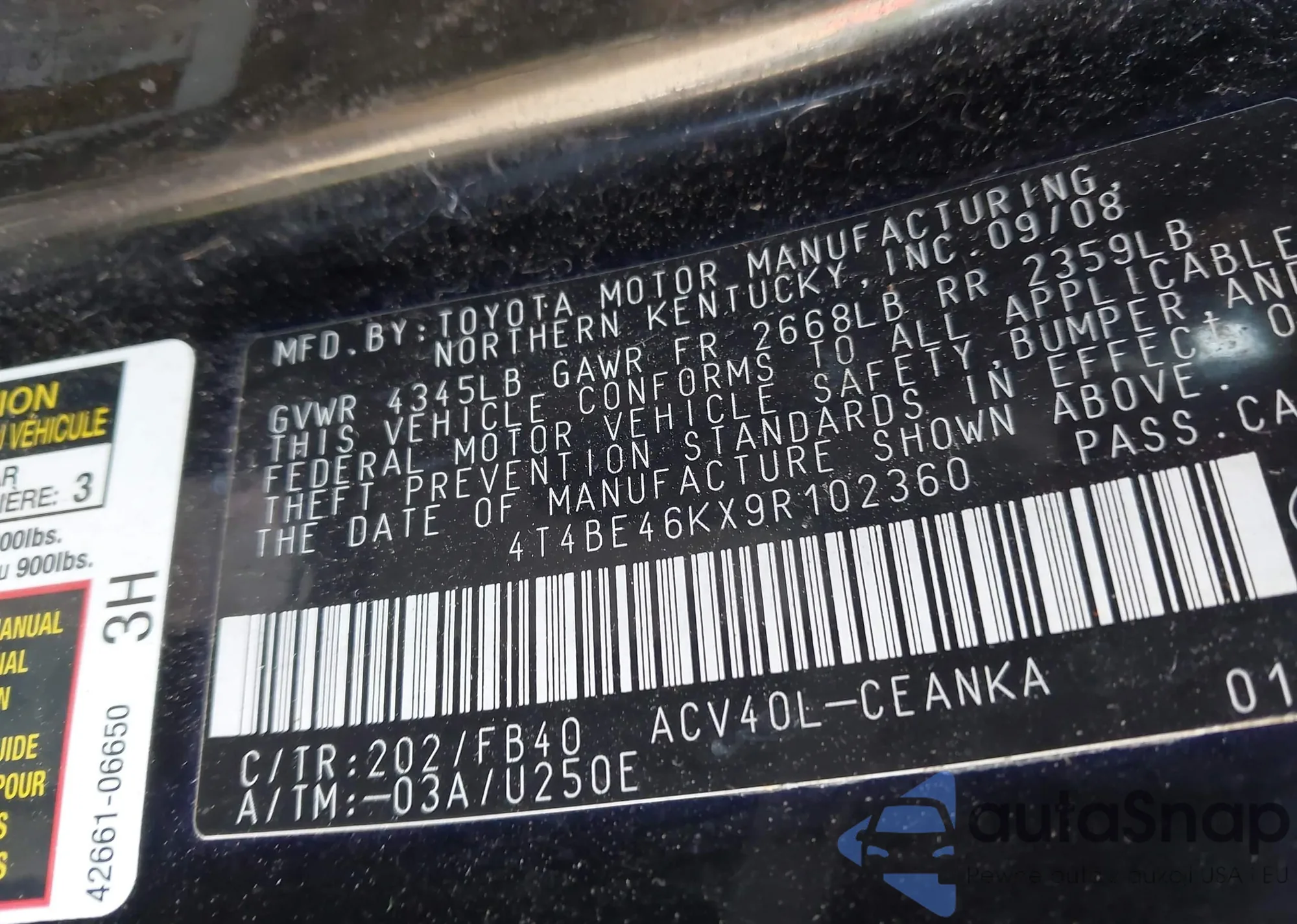 • VIN 4T4BE46KX9R102360