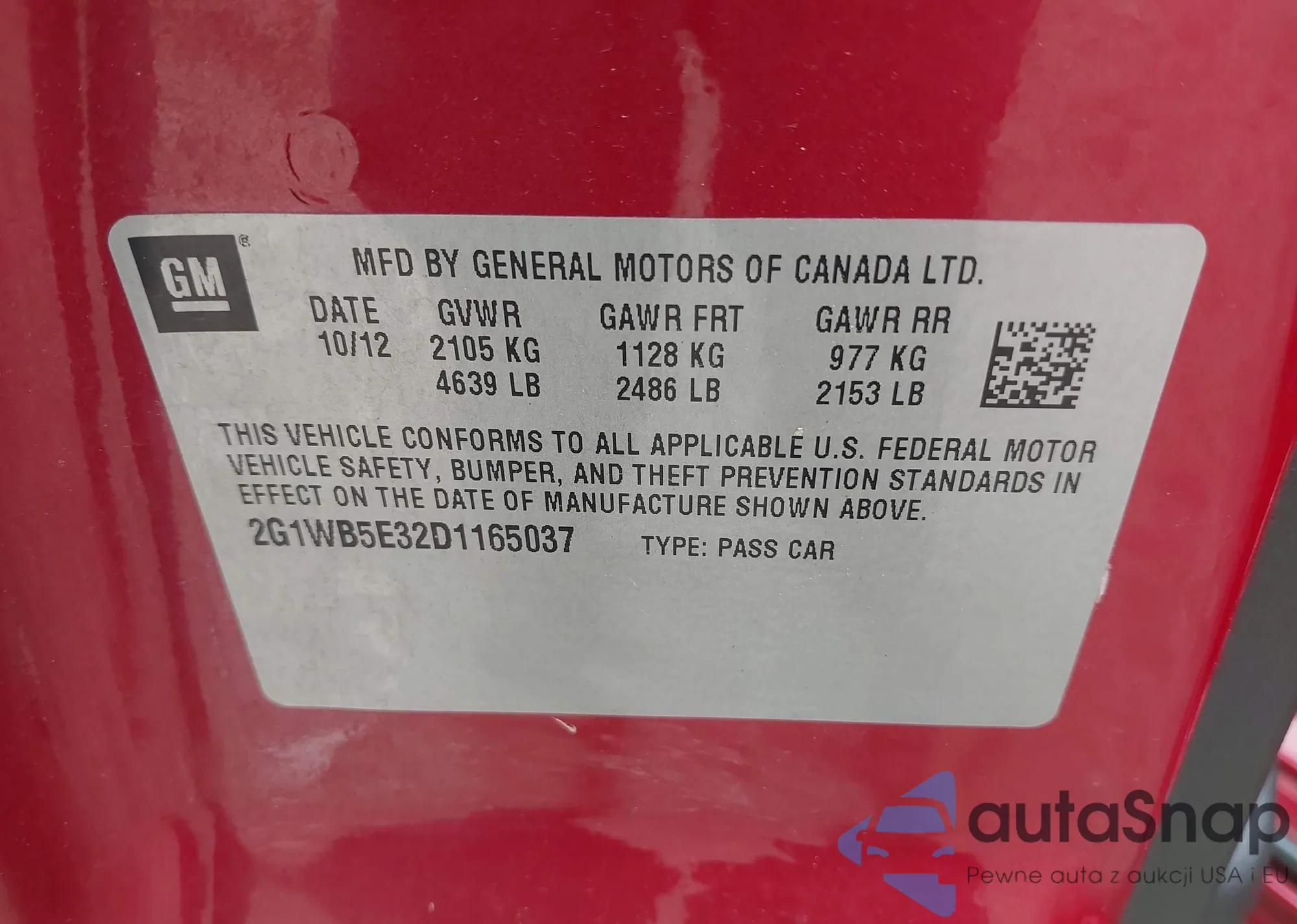 LOT: 42355718 VIN: 2G1WB5E32D1165037