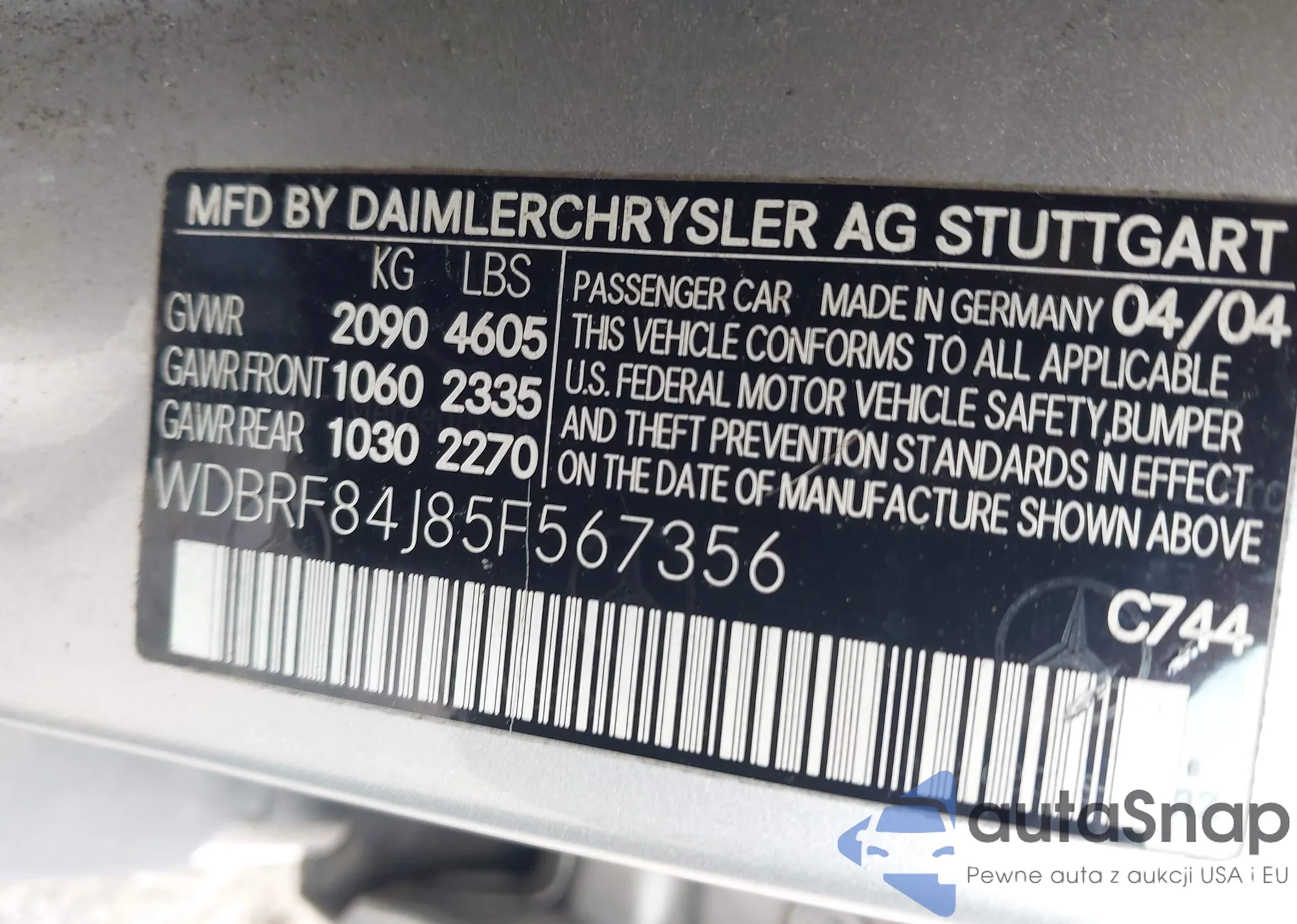 LOT: 42377444 VIN: WDBRF84J85F567356