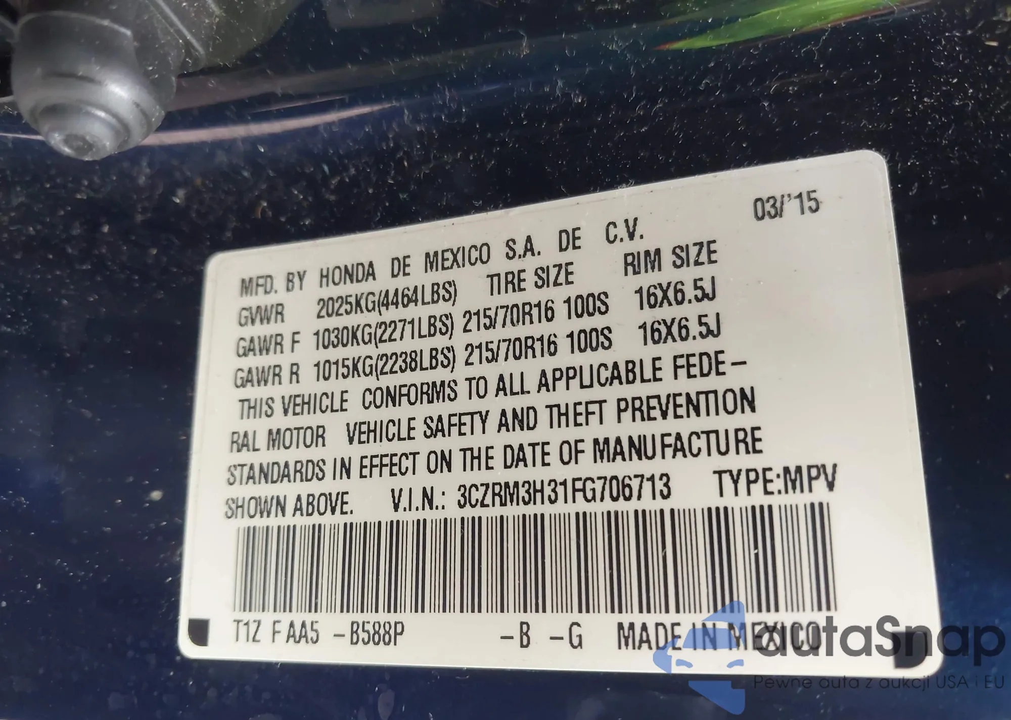 LOT: 42389454 VIN: SHSRD78875U341220