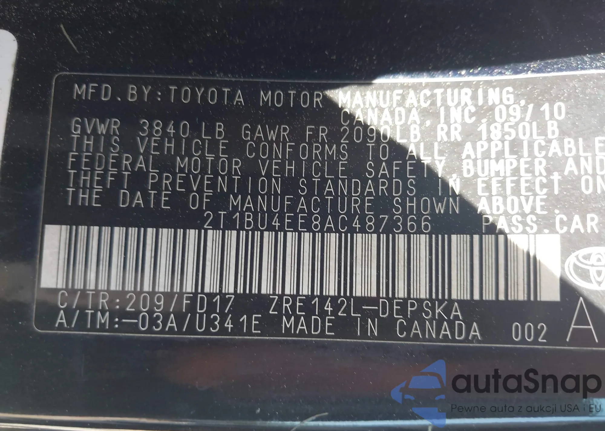 • VIN 2T1BU4EE8AC487366